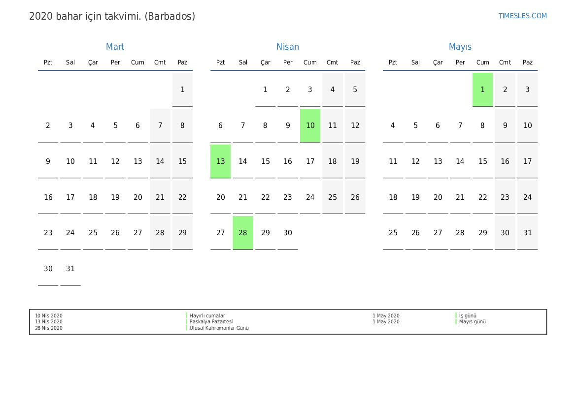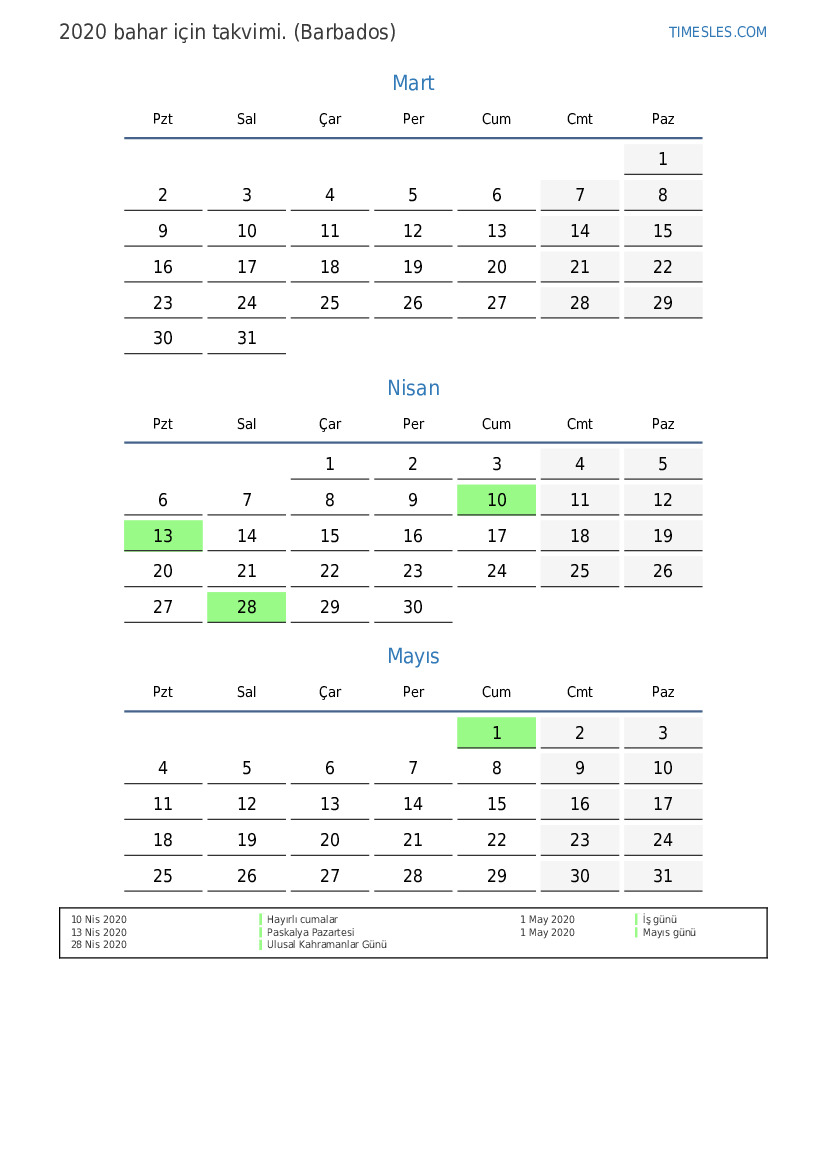 Barbados için 2020 bahar için tatiller ve hafta sonları içeren PDF takvimini indirin ve yazdırın