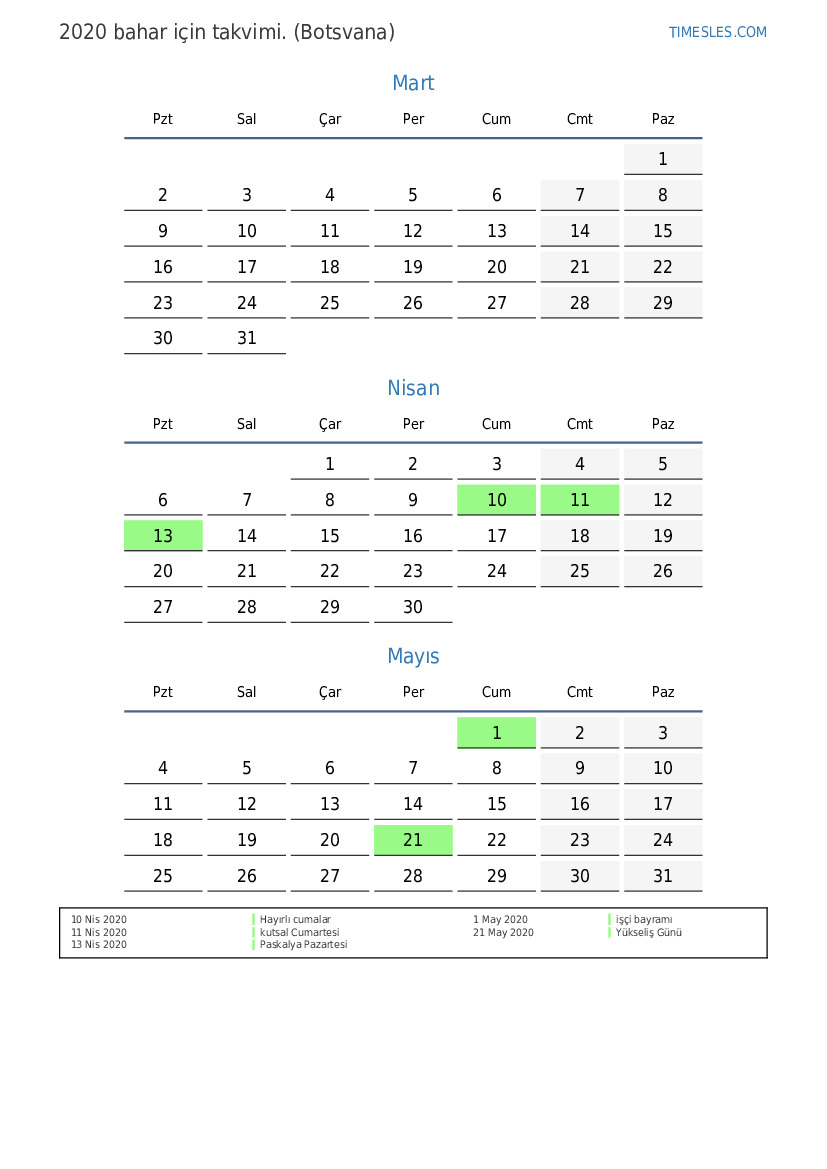 Botsvana için 2020 bahar için tatiller ve hafta sonları içeren PDF takvimini indirin ve yazdırın