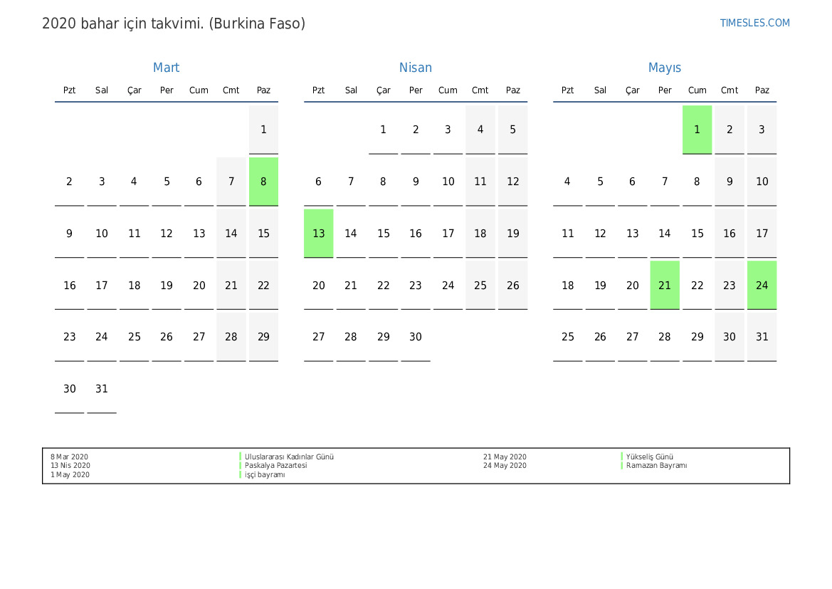 Burkina Faso için 2020 bahar için tatil ve hafta sonları takvimi