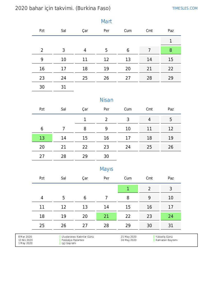 Burkina Faso için 2020 bahar için tatiller ve hafta sonları içeren PDF takvimini indirin ve yazdırın