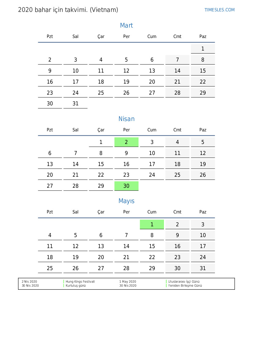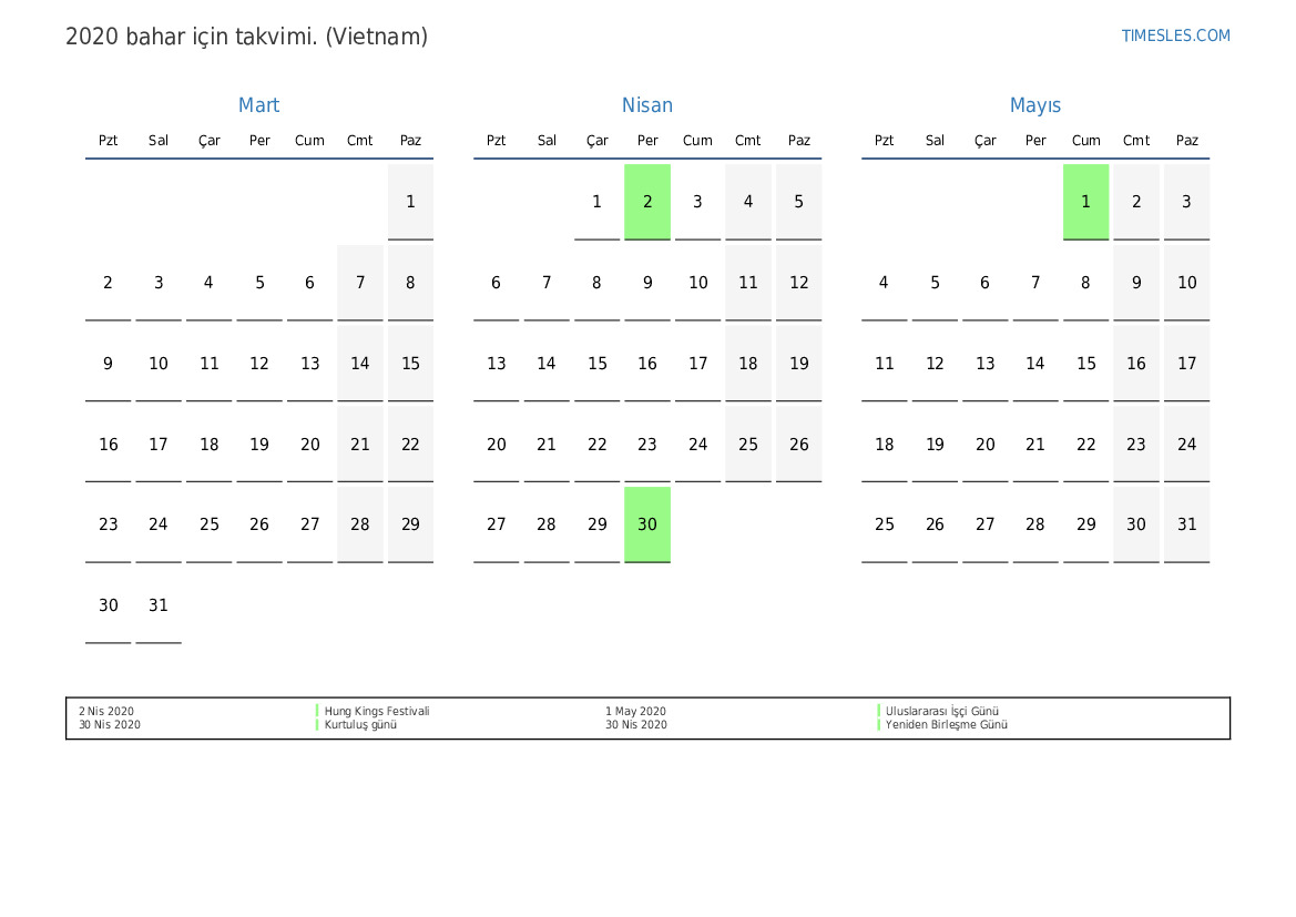 Vietnam için 2020 bahar için tatiller ve hafta sonları içeren PDF takvimini indirin ve yazdırın