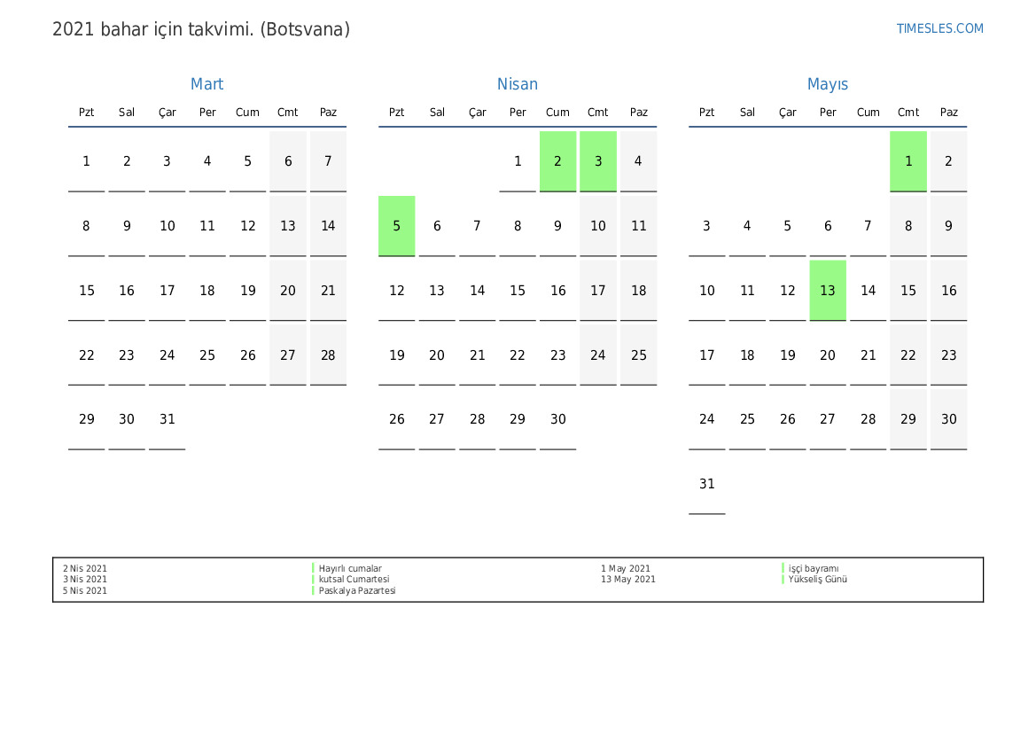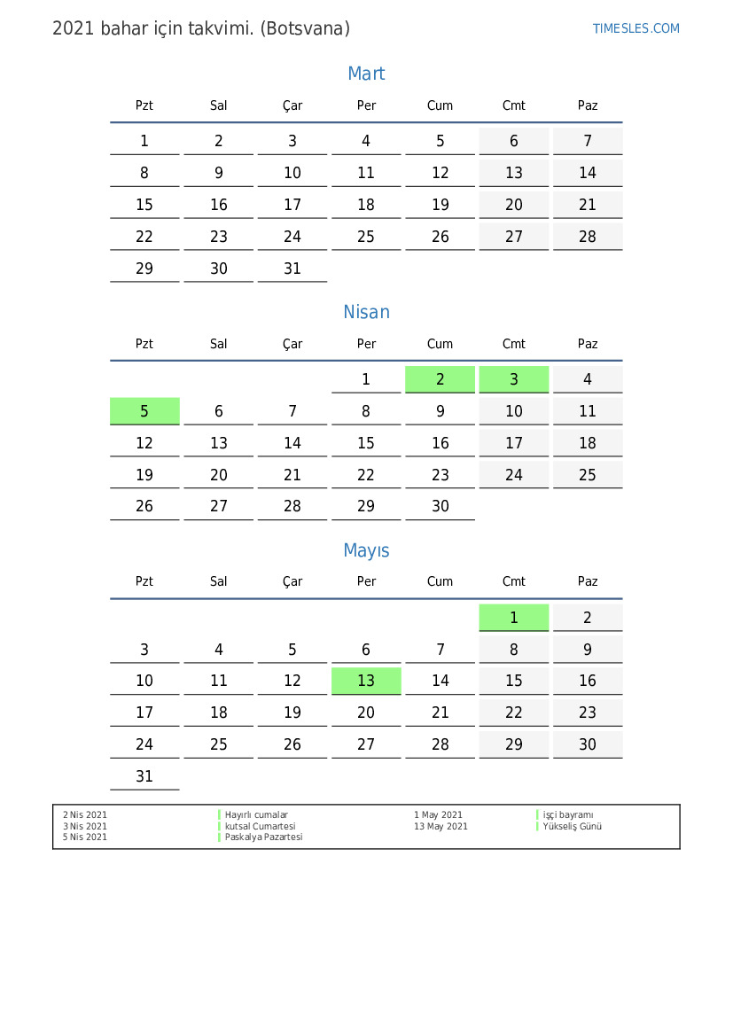 Botsvana için 2021 bahar için tatiller ve hafta sonları içeren PDF takvimini indirin ve yazdırın