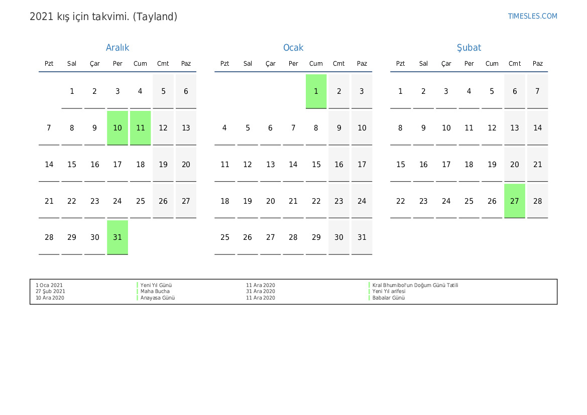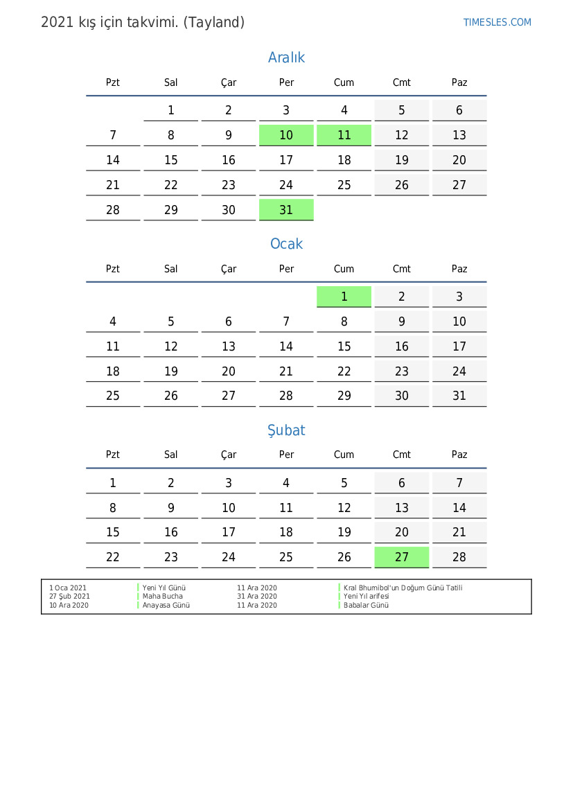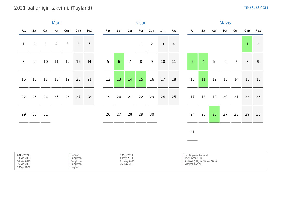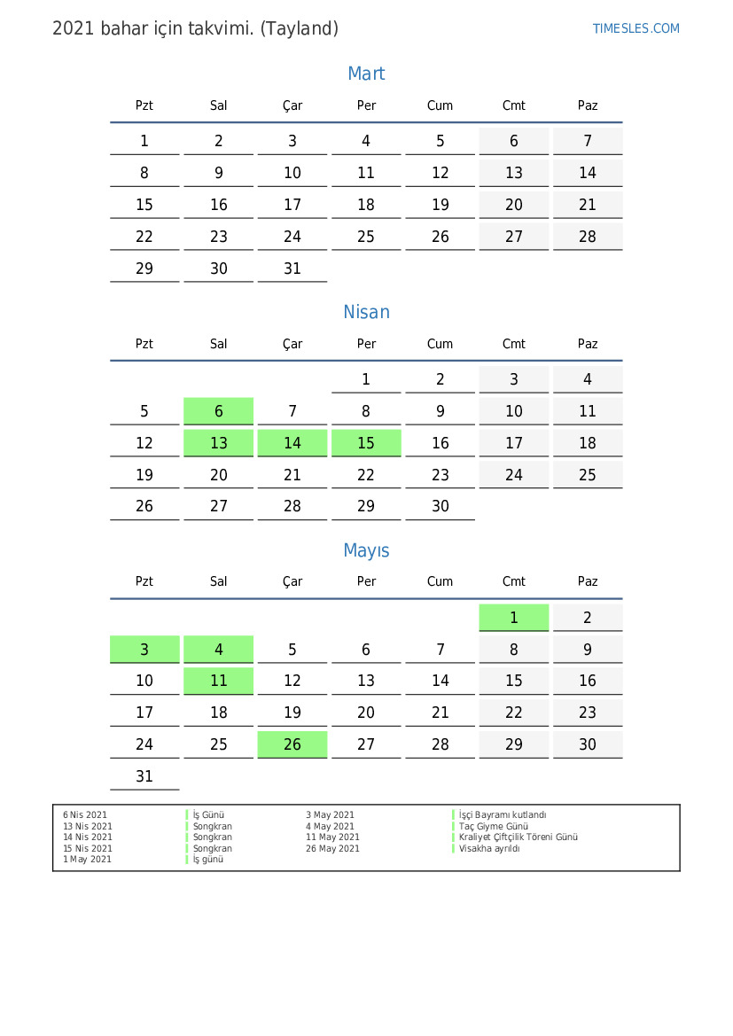Tayland için 2021 bahar için tatil ve hafta sonları takvimi