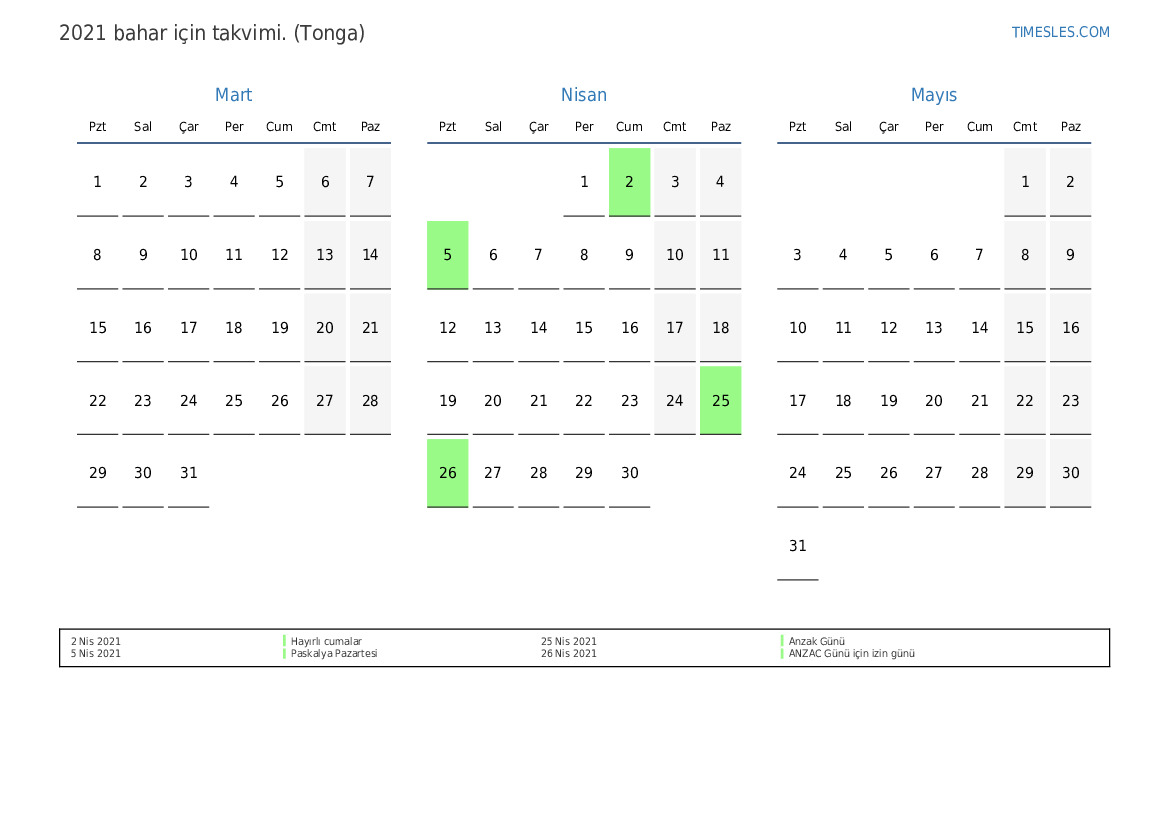 Tonga için 2021 bahar için tatil ve hafta sonları takvimi