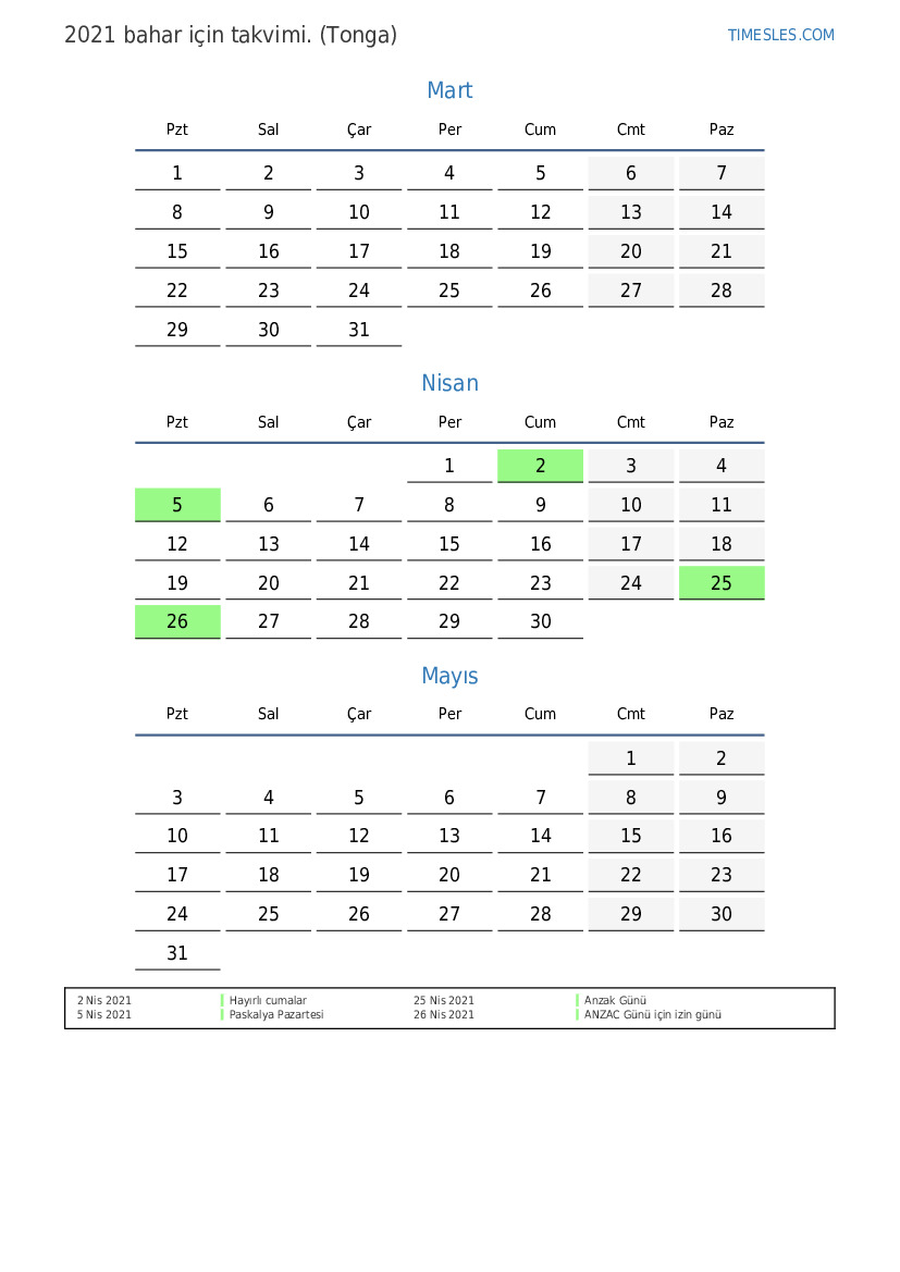 Tonga için 2021 bahar için tatiller ve hafta sonları içeren PDF takvimini indirin ve yazdırın