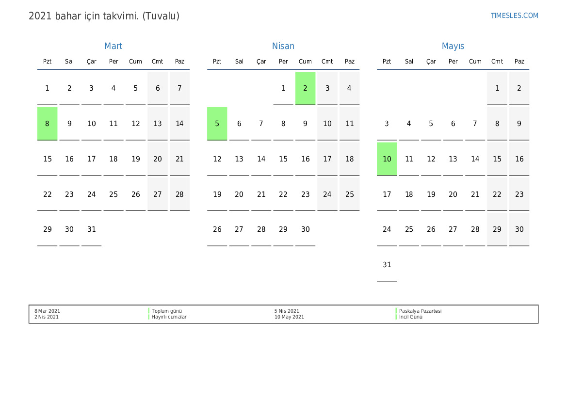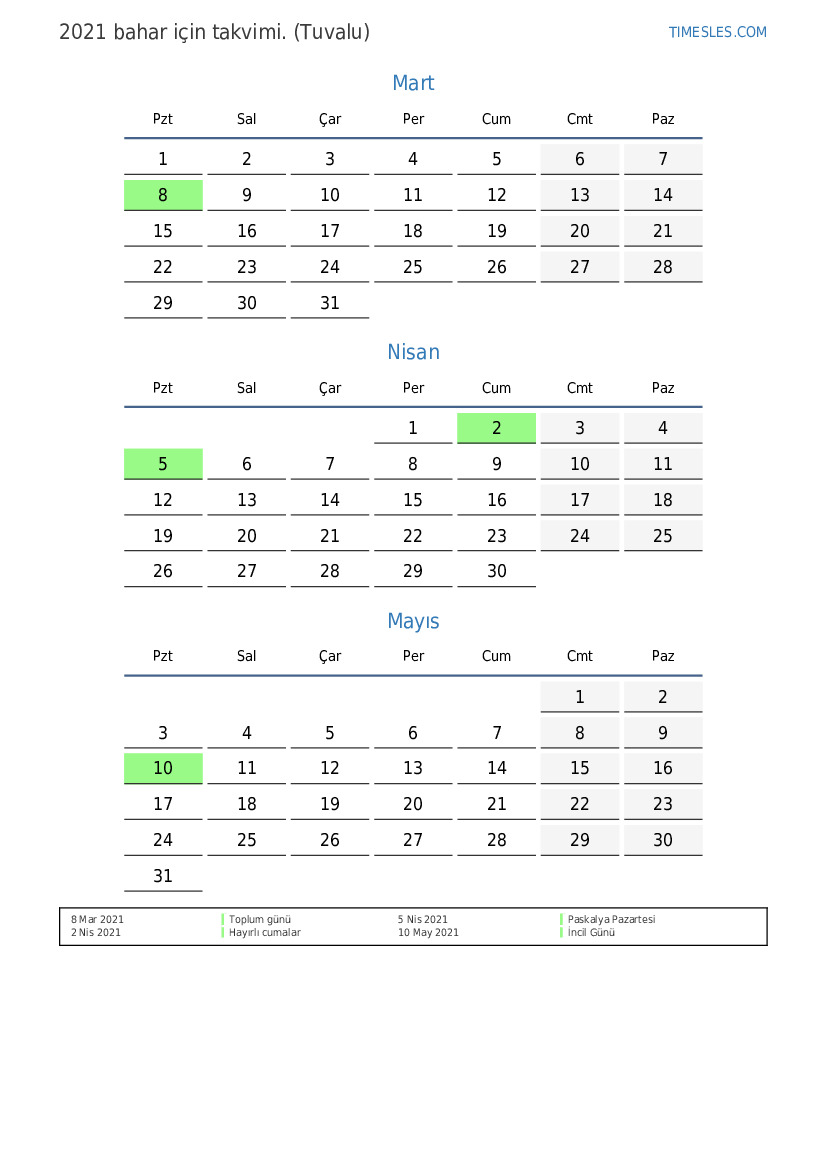 Tuvalu için 2021 bahar için tatiller ve hafta sonları içeren PDF takvimini indirin ve yazdırın