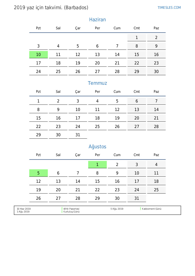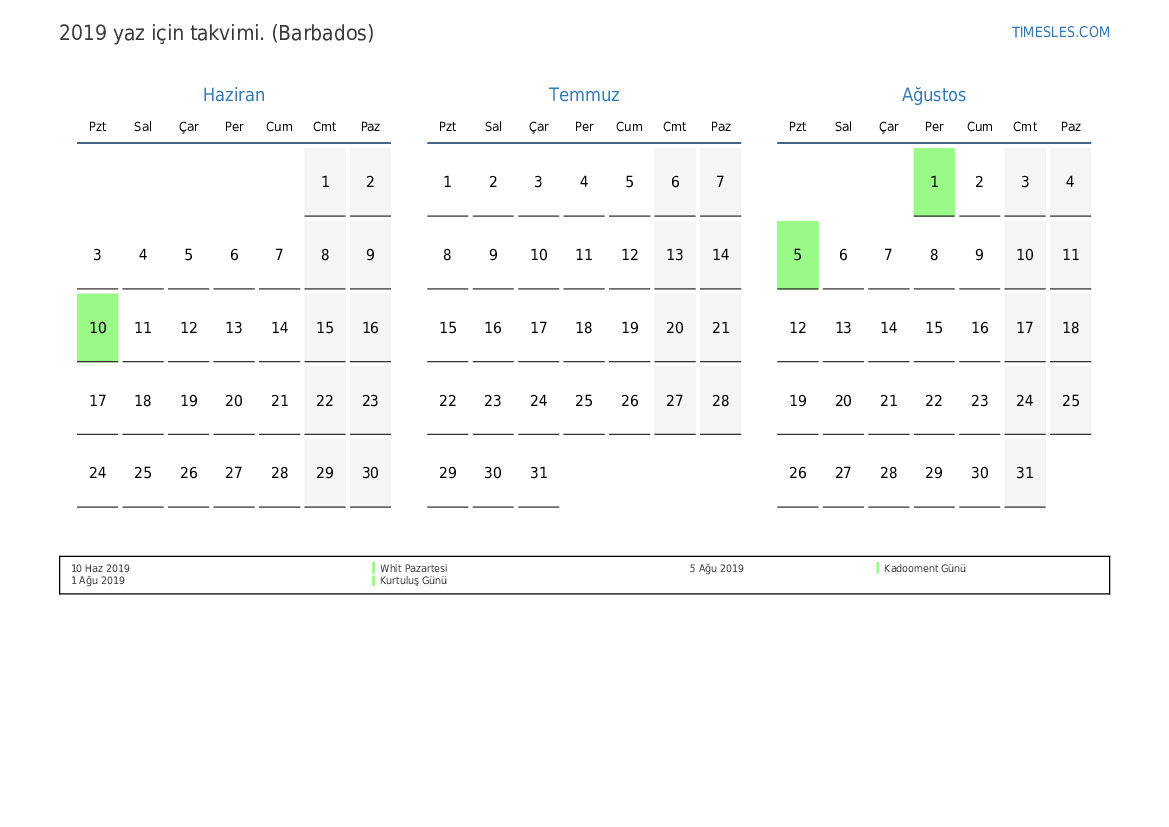 Barbados için 2019 yaz için tatiller ve hafta sonları içeren PDF takvimini indirin ve yazdırın