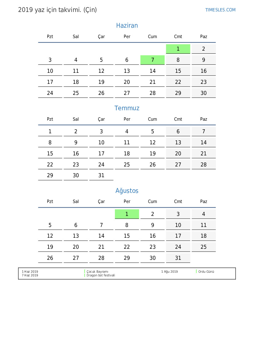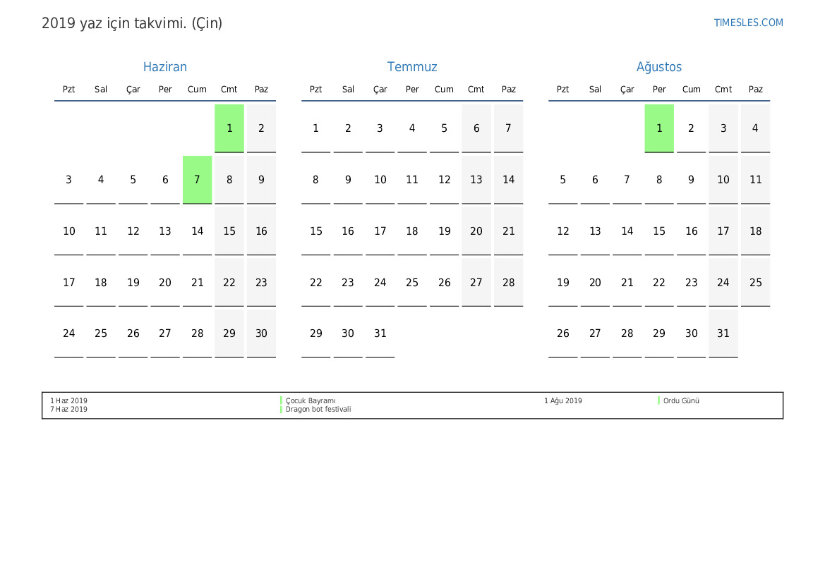 Çin için 2019 yaz için tatiller ve hafta sonları içeren PDF takvimini indirin ve yazdırın
