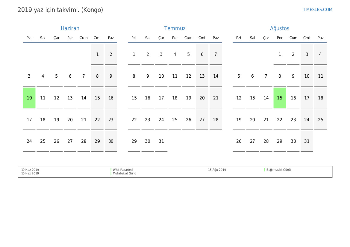 Kongo için 2019 yaz için tatiller ve hafta sonları içeren PDF takvimini indirin ve yazdırın