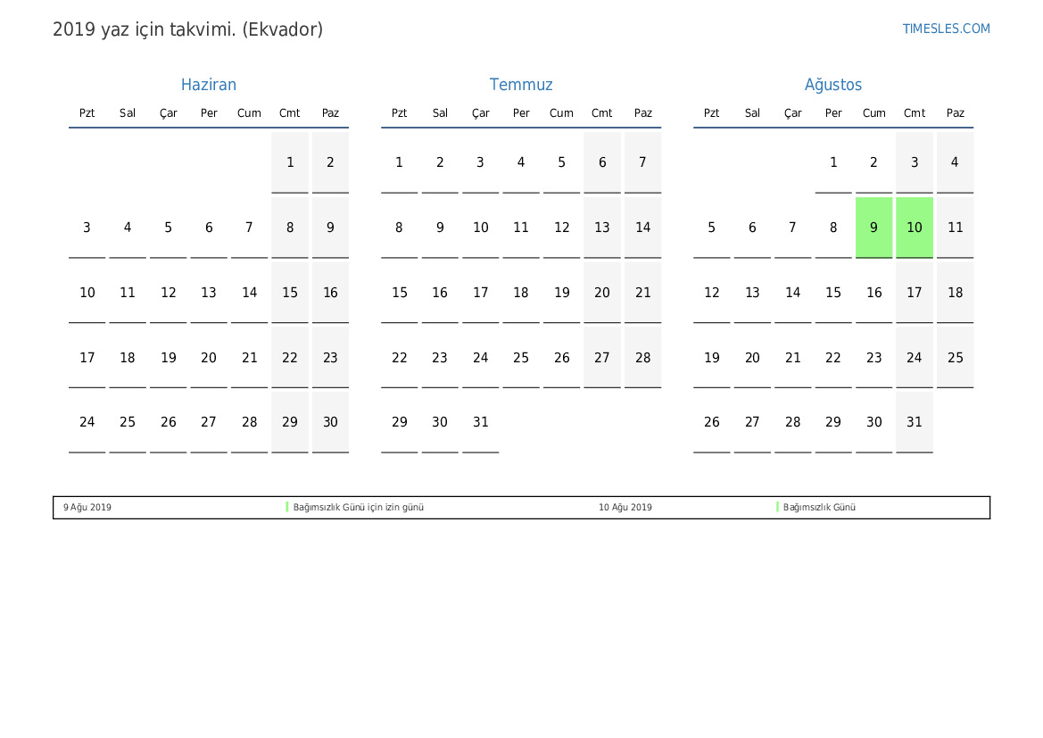 Ekvador için 2019 yaz için tatiller ve hafta sonları içeren PDF takvimini indirin ve yazdırın