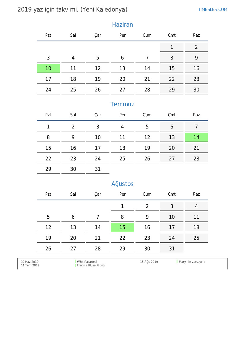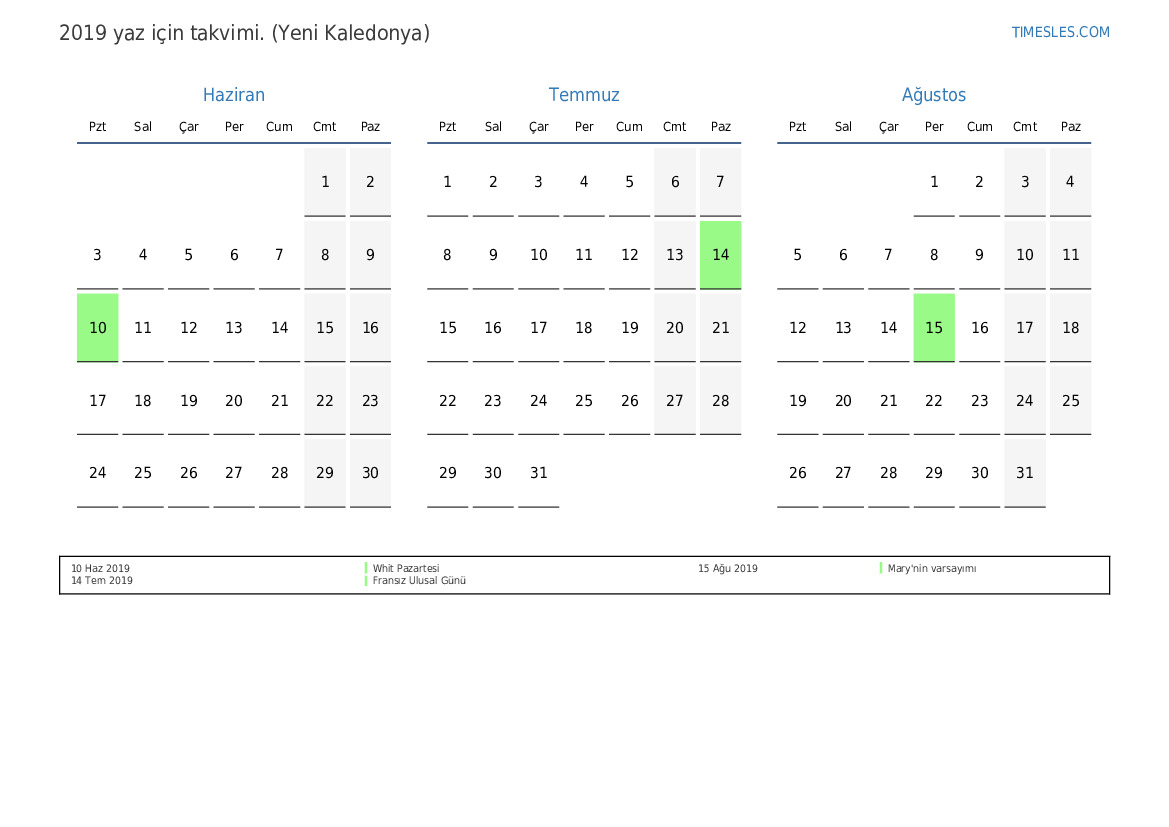 Yeni Kaledonya için 2019 yaz için tatiller ve hafta sonları içeren PDF takvimini indirin ve yazdırın