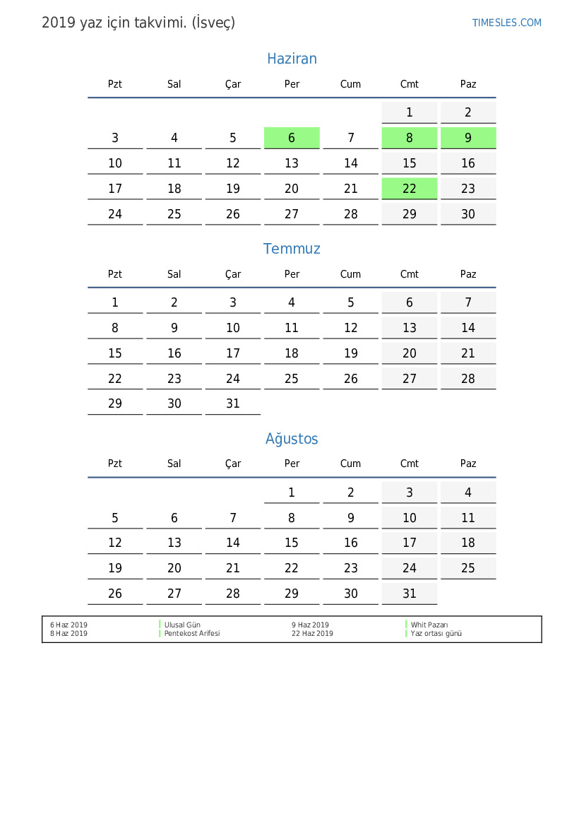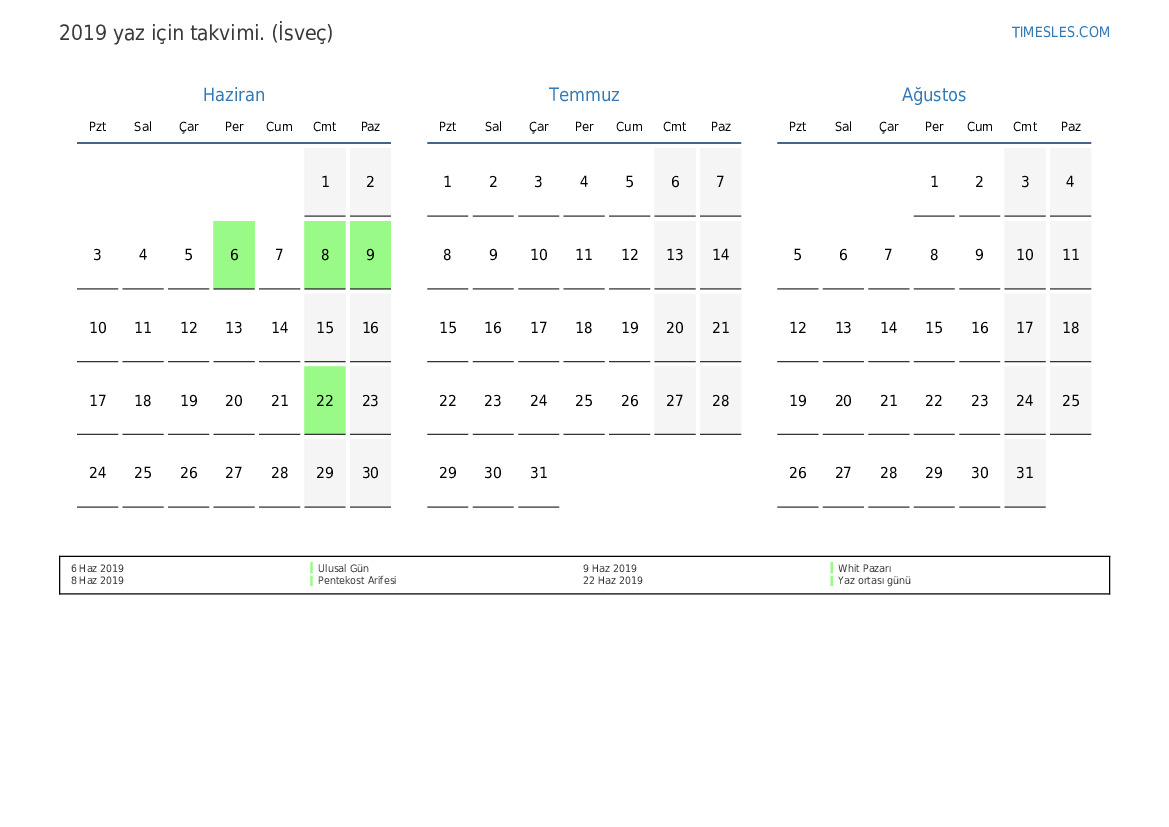 isveçte 2019 yaz için takvimi