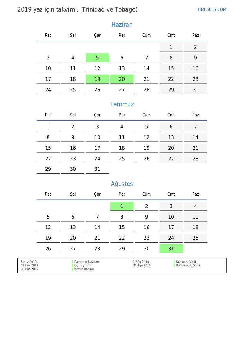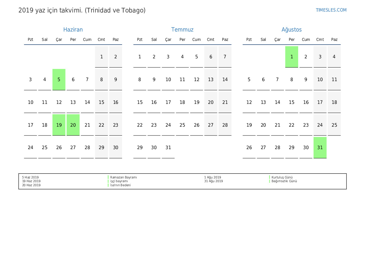 Trinidad ve Tobago için 2019 yaz için tatiller ve hafta sonları içeren PDF takvimini indirin ve yazdırın