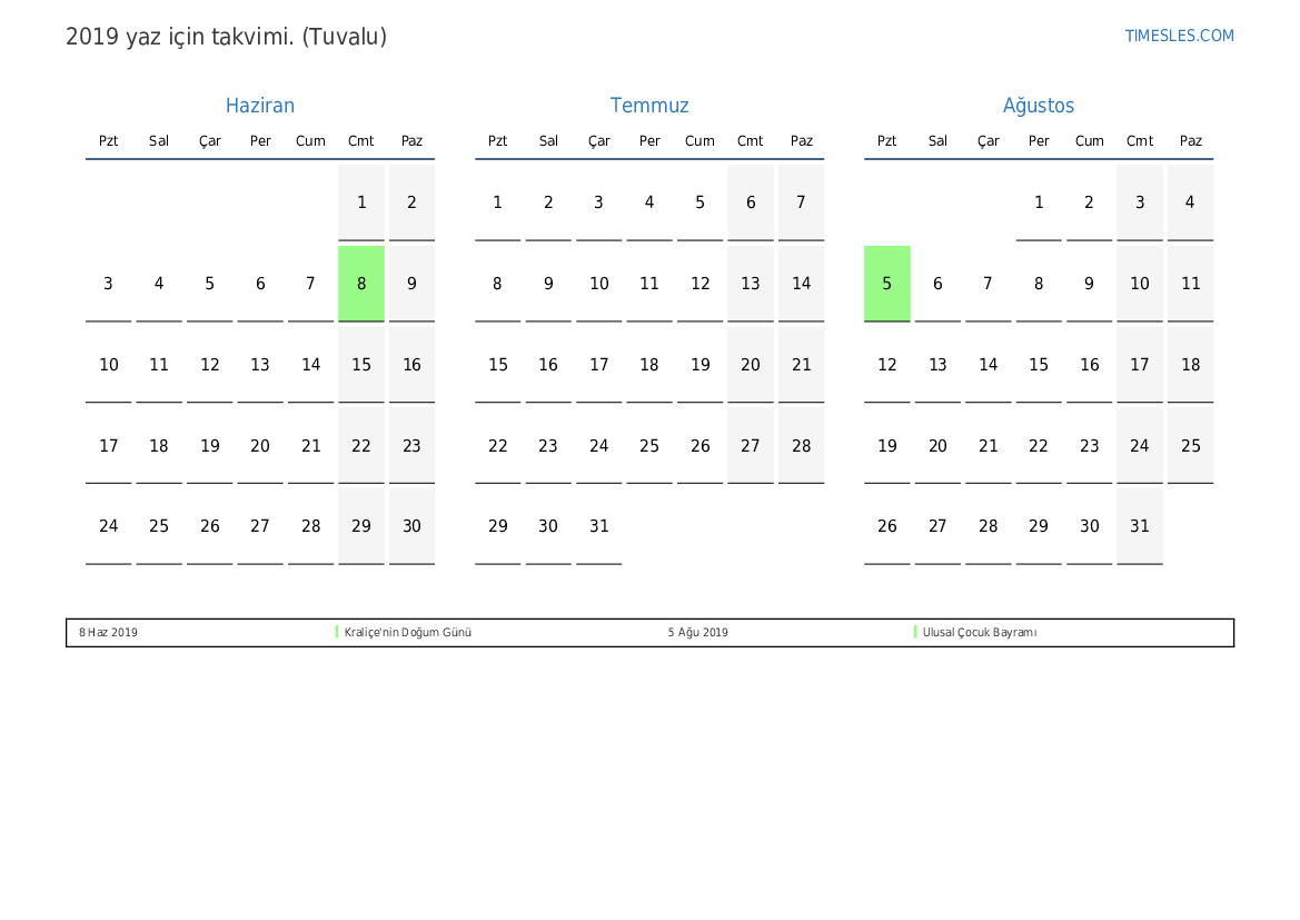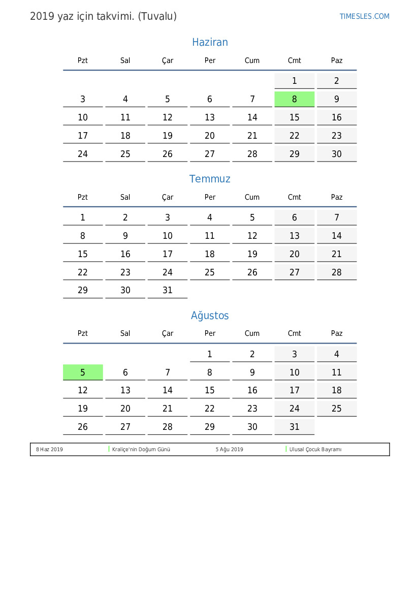 Tuvalu için 2019 yaz için tatiller ve hafta sonları içeren PDF takvimini indirin ve yazdırın