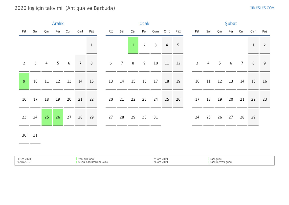 Antigua ve Barbuda için 2020 yaz için tatil ve hafta sonları takvimi