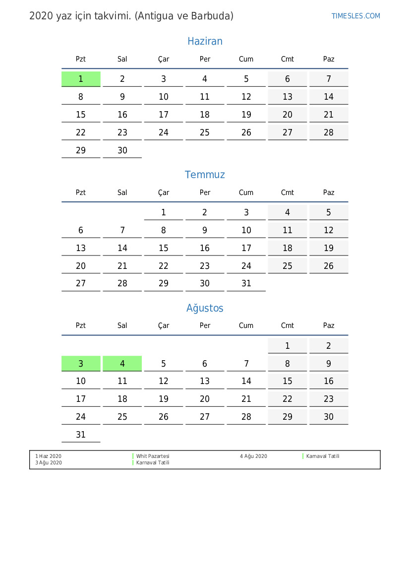 Antigua ve Barbuda için 2020 yaz için tatiller ve hafta sonları içeren PDF takvimini indirin ve yazdırın