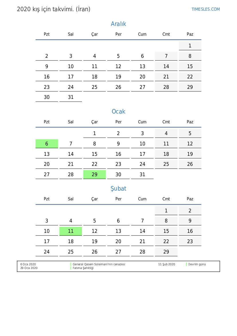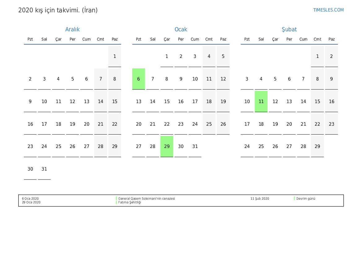 İran için 2020 yaz için tatil ve hafta sonları takvimi