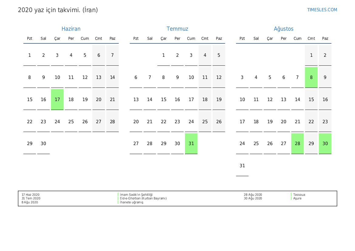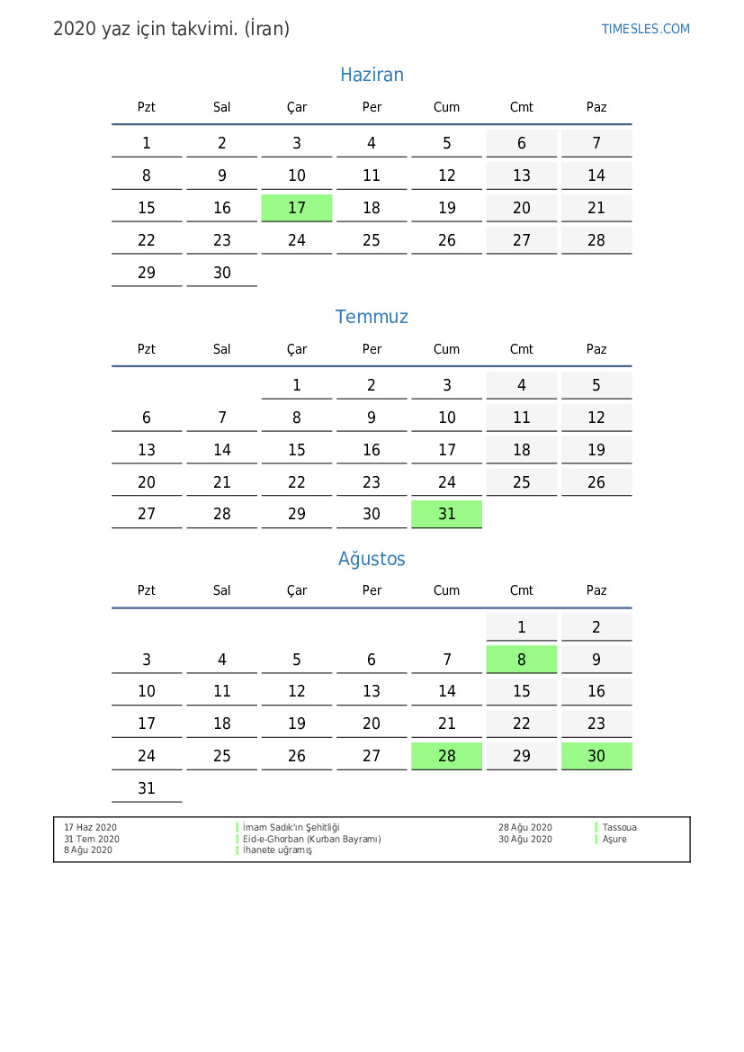 İran için 2020 yaz için tatiller ve hafta sonları içeren PDF takvimini indirin ve yazdırın