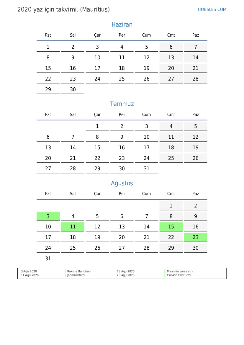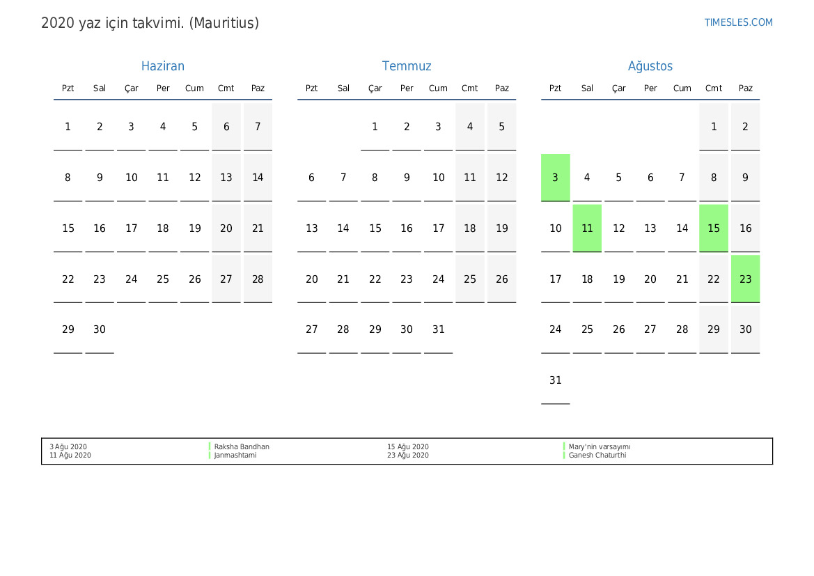 Mauritius için 2020 yaz için tatiller ve hafta sonları içeren PDF takvimini indirin ve yazdırın