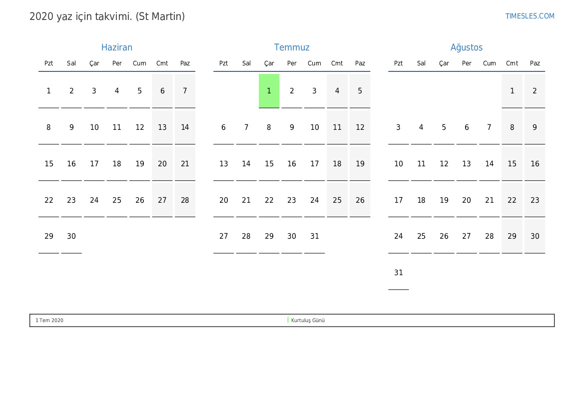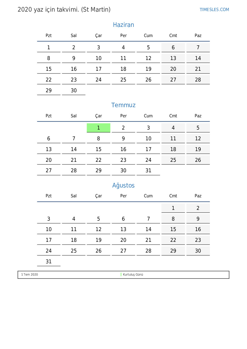 Sint Maarten için 2020 yaz için tatiller ve hafta sonları içeren PDF takvimini indirin ve yazdırın