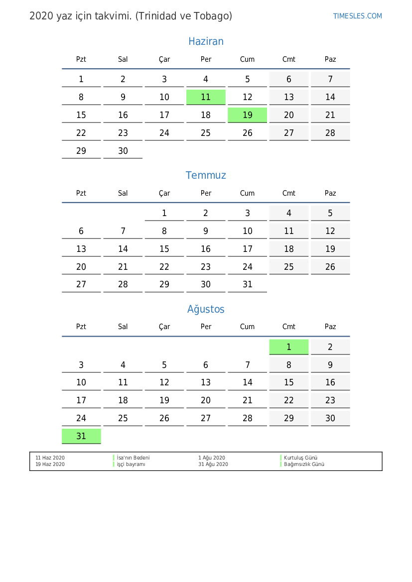 Trinidad ve Tobago için 2020 yaz için tatiller ve hafta sonları içeren PDF takvimini indirin ve yazdırın