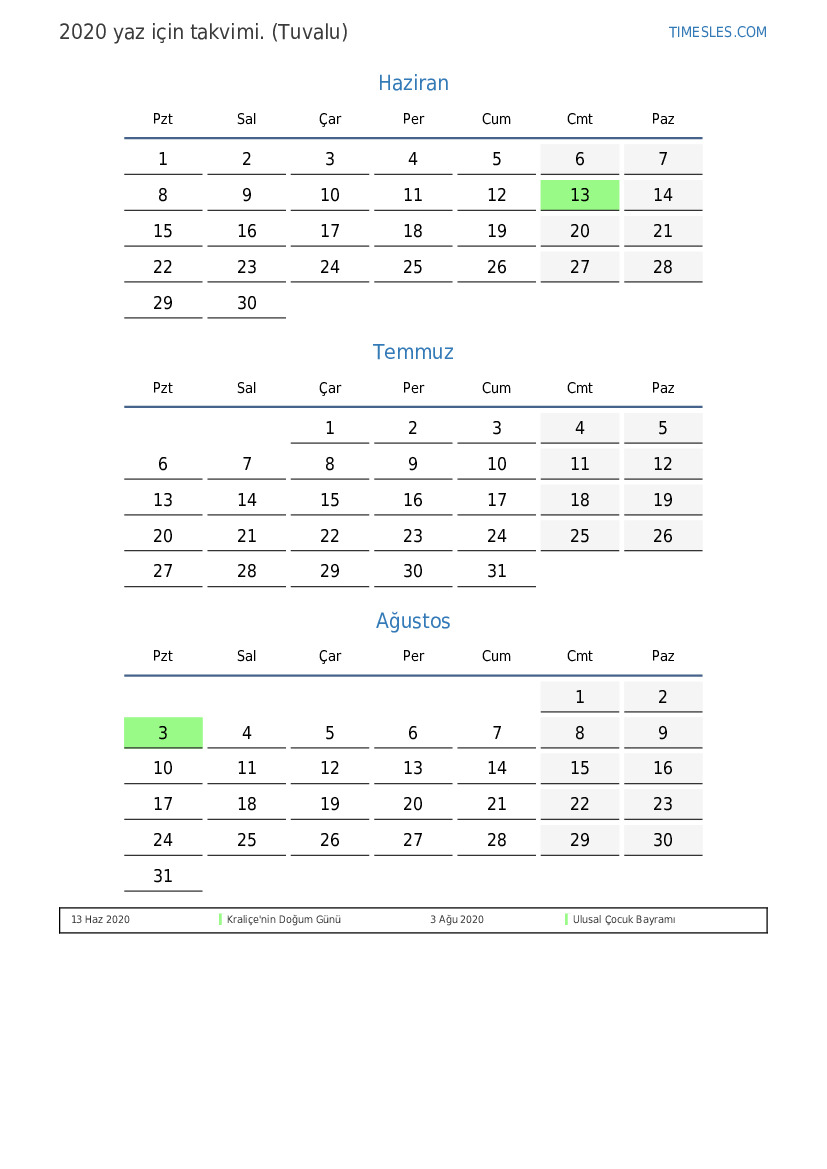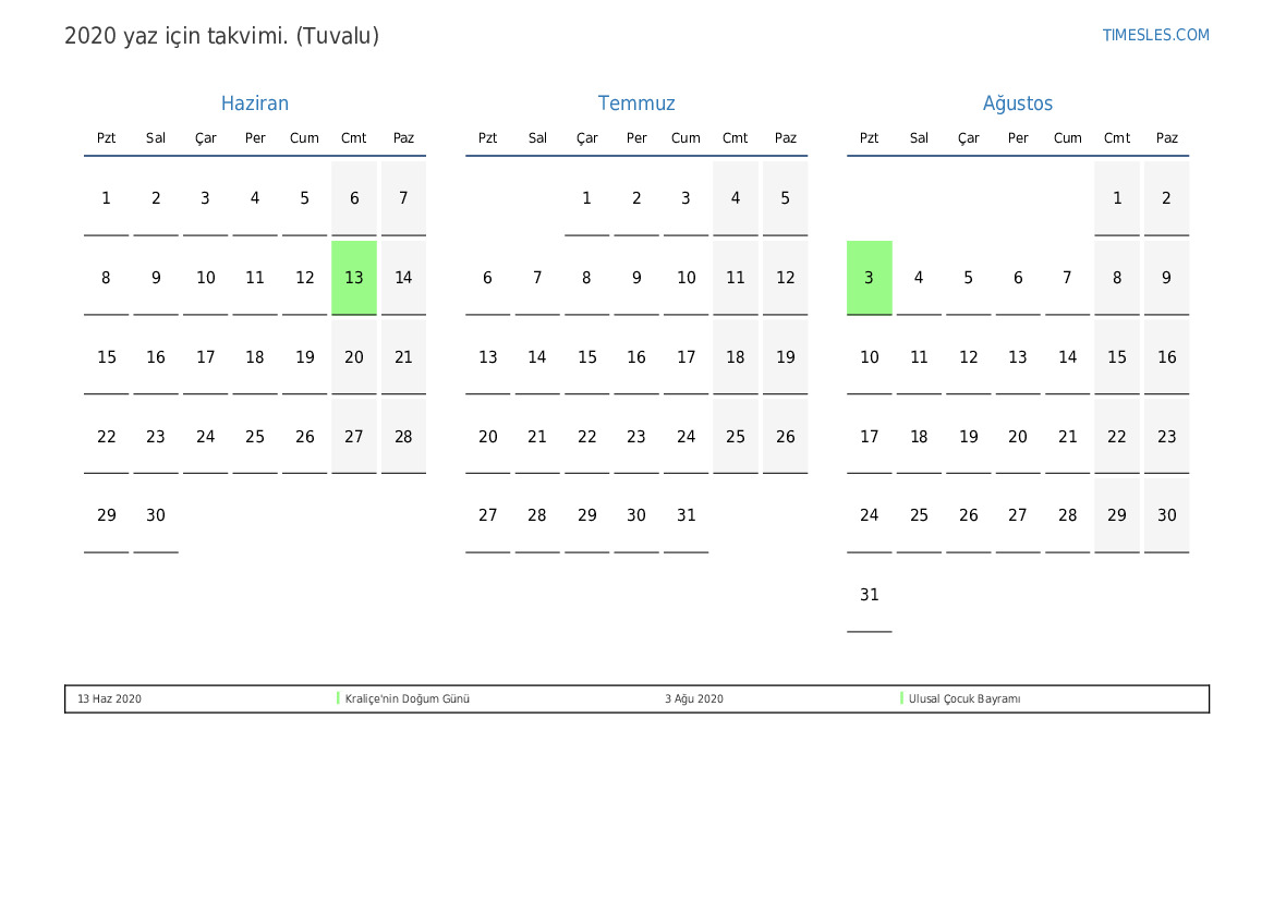 Tuvalu için 2020 yaz için tatiller ve hafta sonları içeren PDF takvimini indirin ve yazdırın