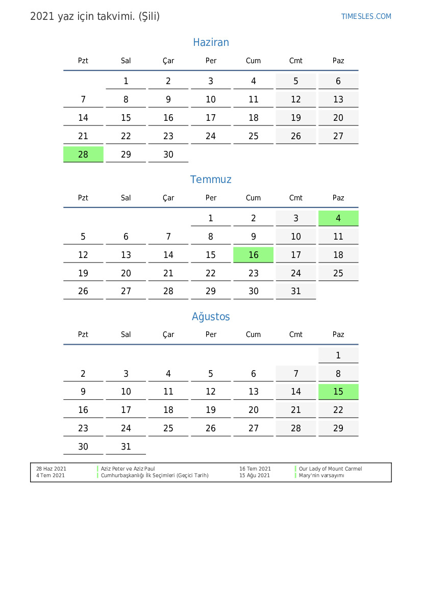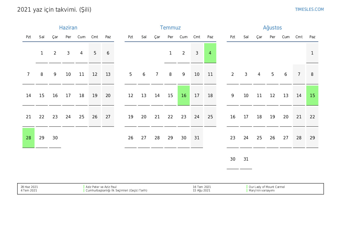 Şili için 2021 yaz için tatiller ve hafta sonları içeren PDF takvimini indirin ve yazdırın