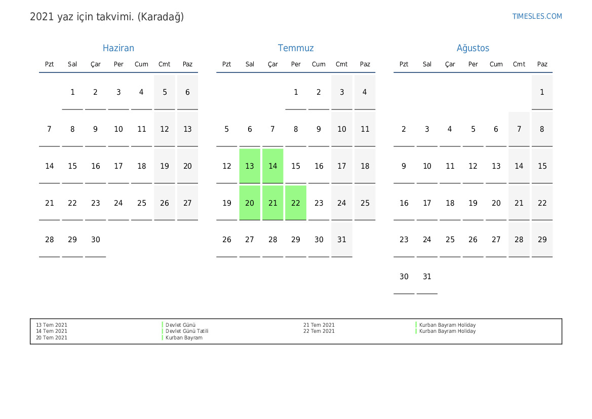 Karadağ için 2021 yaz için tatil ve hafta sonları takvimi