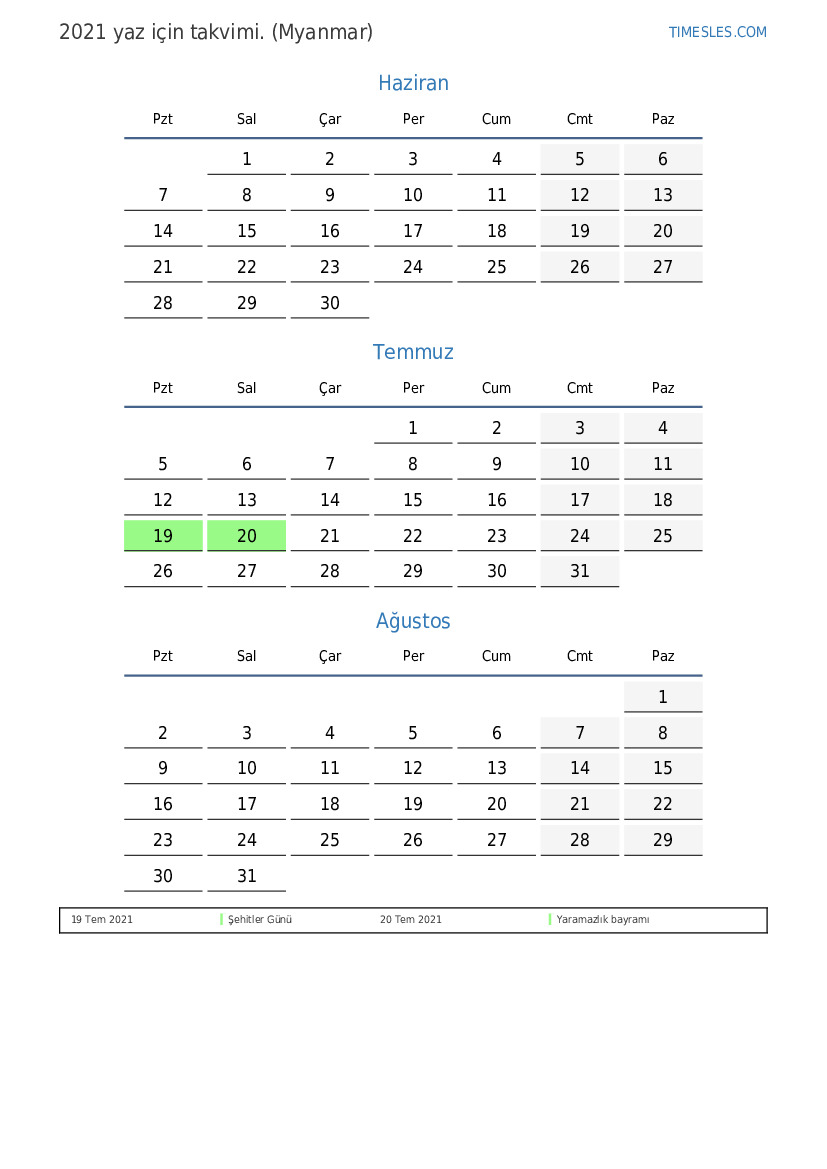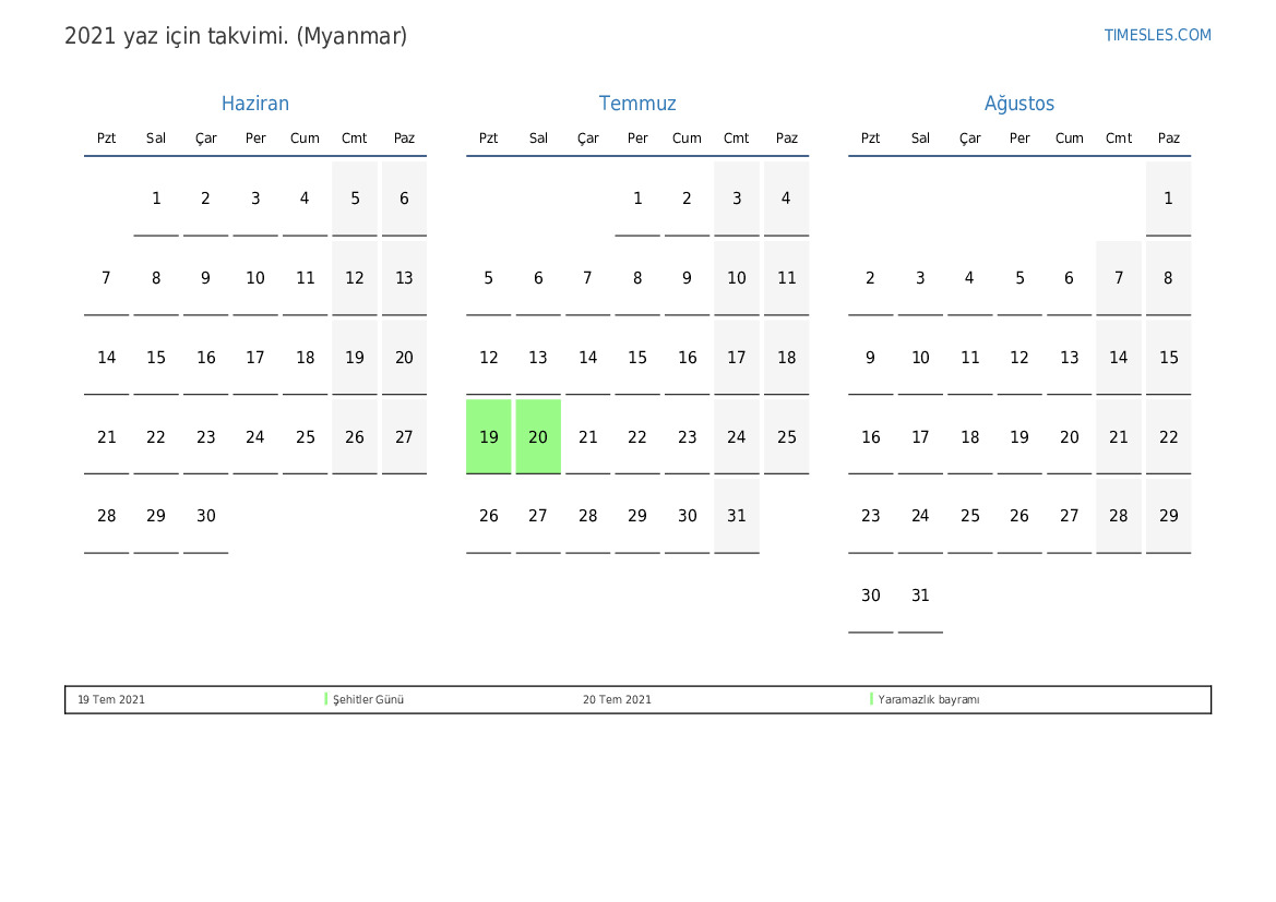 Myanmar için 2021 yaz için tatil ve hafta sonları takvimi