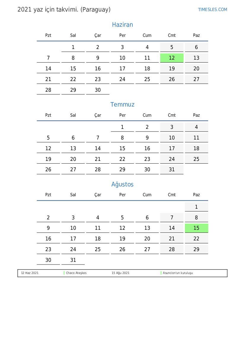 Paraguay için 2021 yaz için tatil ve hafta sonları takvimi
