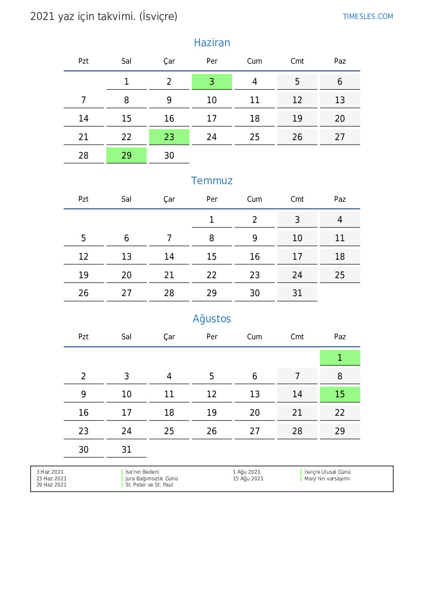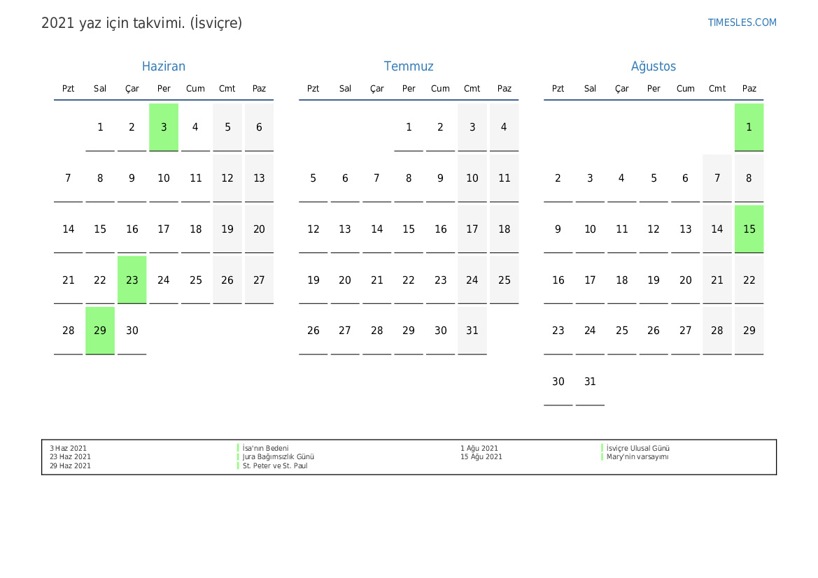 İsviçre için 2021 yaz için tatil ve hafta sonları takvimi