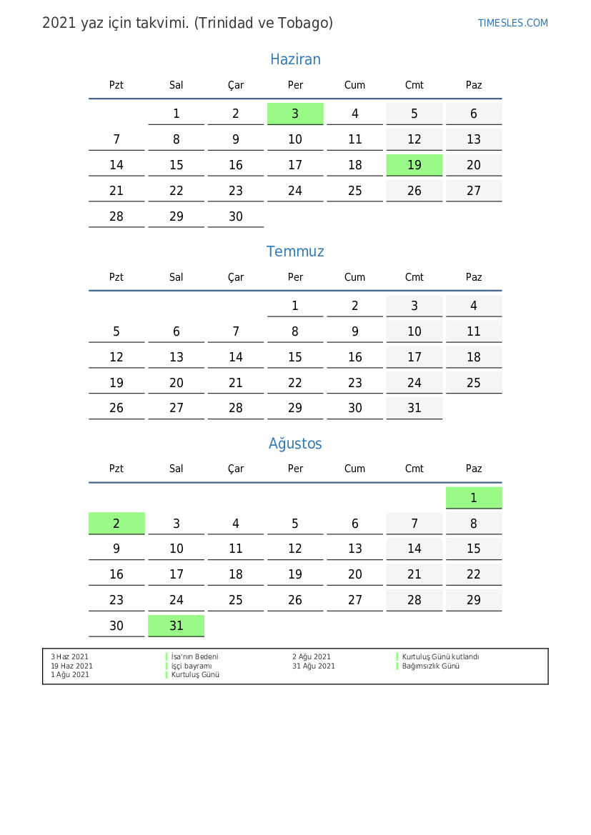 Trinidad ve Tobago için 2021 yaz için tatiller ve hafta sonları içeren PDF takvimini indirin ve yazdırın