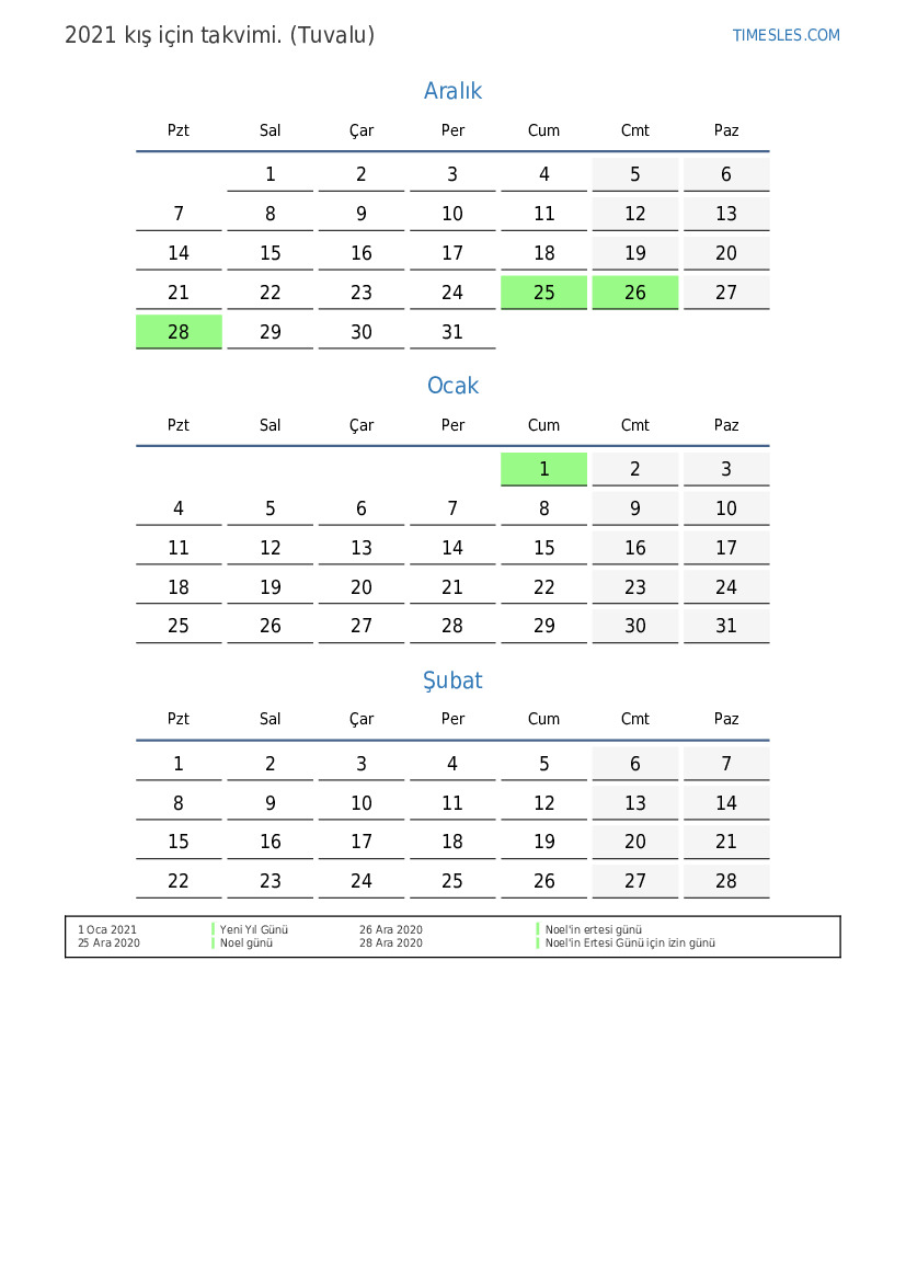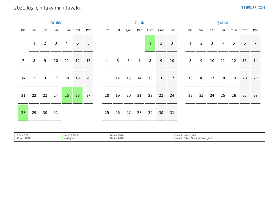 2021 Yazın Tuvalu'da 3 tatil ve tatil günleri var. Yaz 2021 Salı günü başlar ve Salı günü biter.