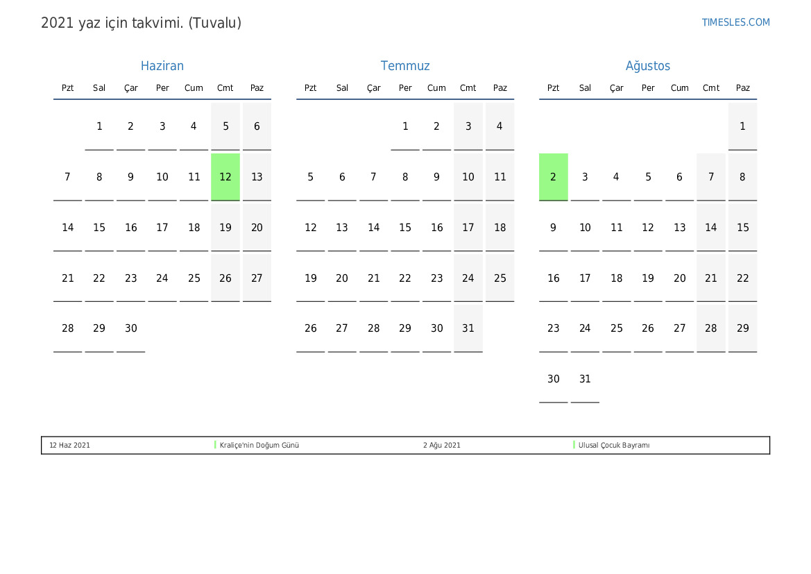 Tuvalu için 2021 yaz için tatil ve hafta sonları takvimi