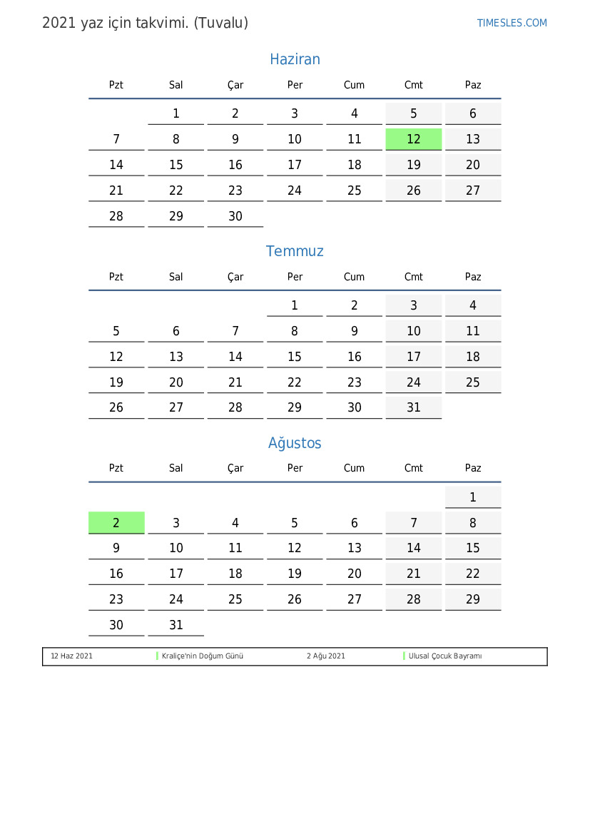Tuvalu için 2021 yaz için tatiller ve hafta sonları içeren PDF takvimini indirin ve yazdırın