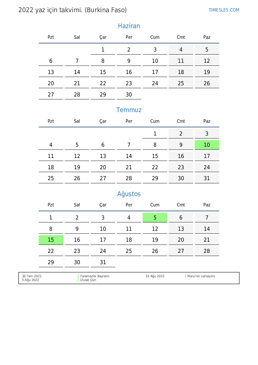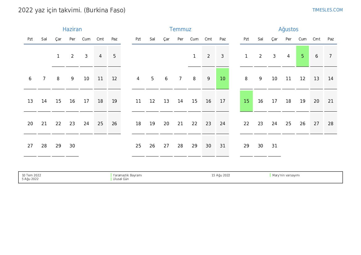 Burkina Faso için 2022 yaz için tatil ve hafta sonları takvimi