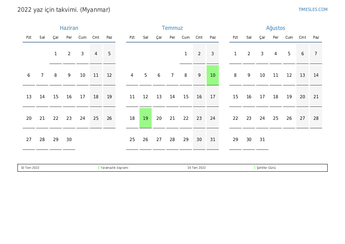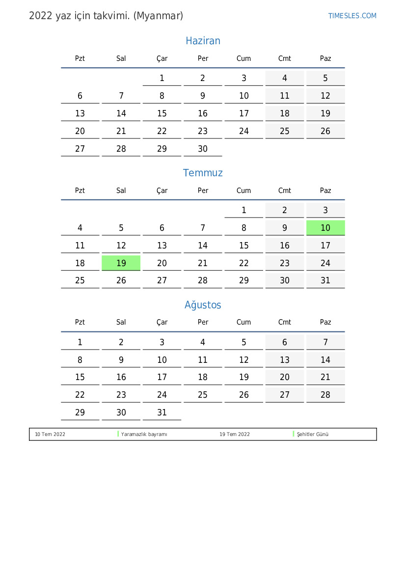 Myanmar için 2022 yaz için tatil ve hafta sonları takvimi