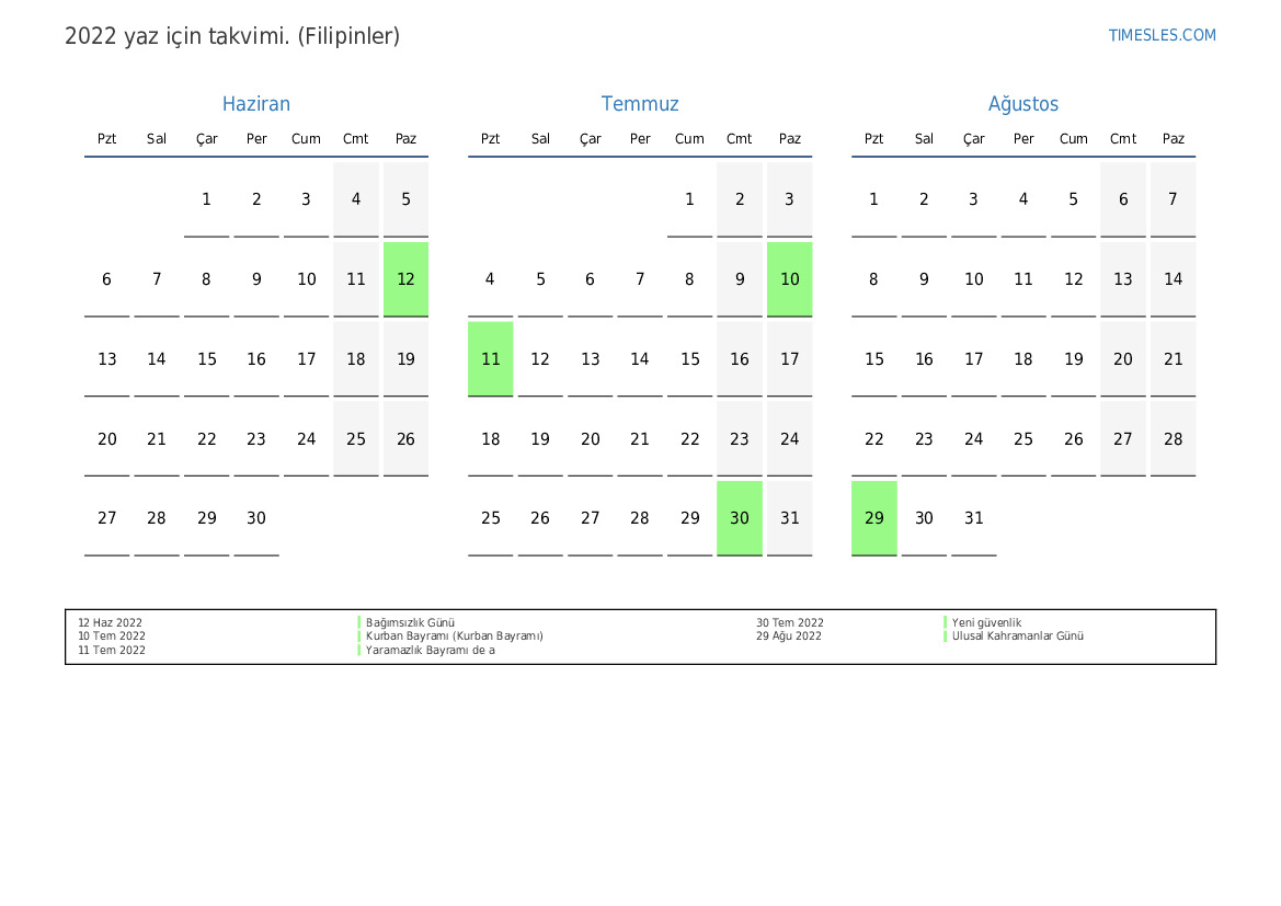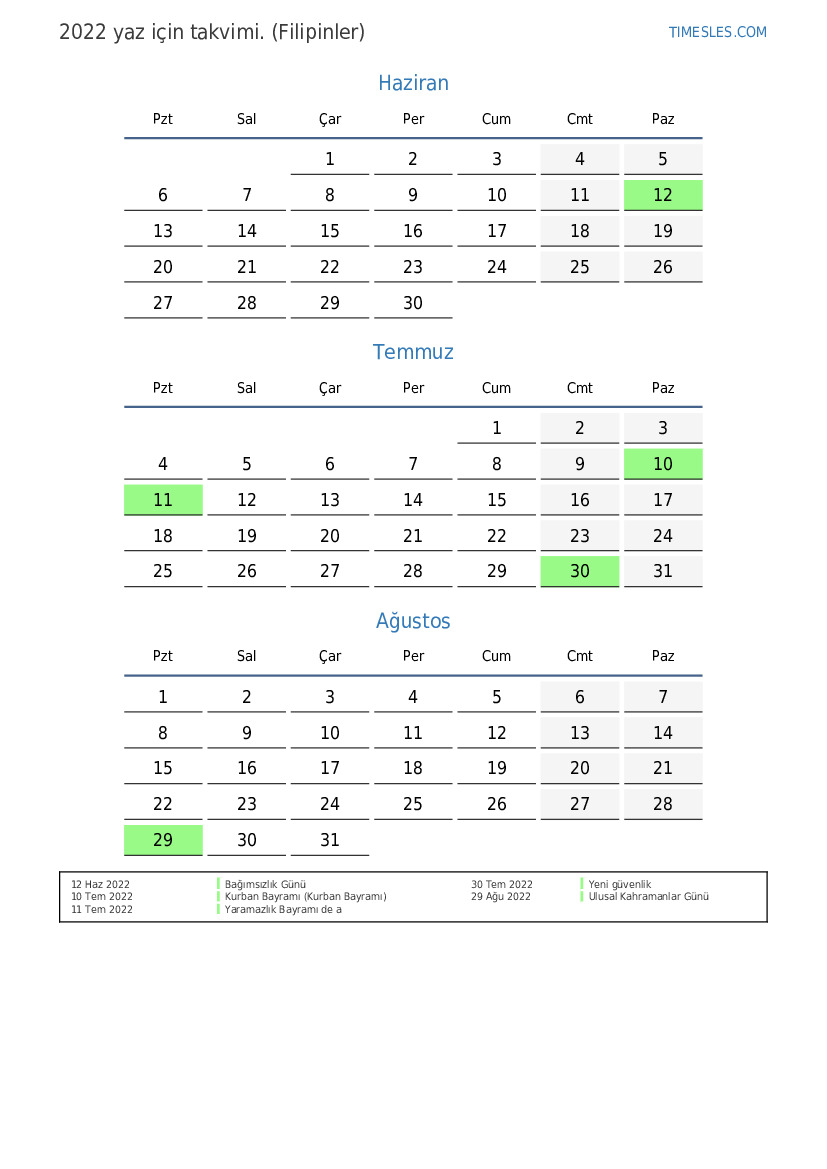 Filipinler için 2022 yaz için tatil ve hafta sonları takvimi
