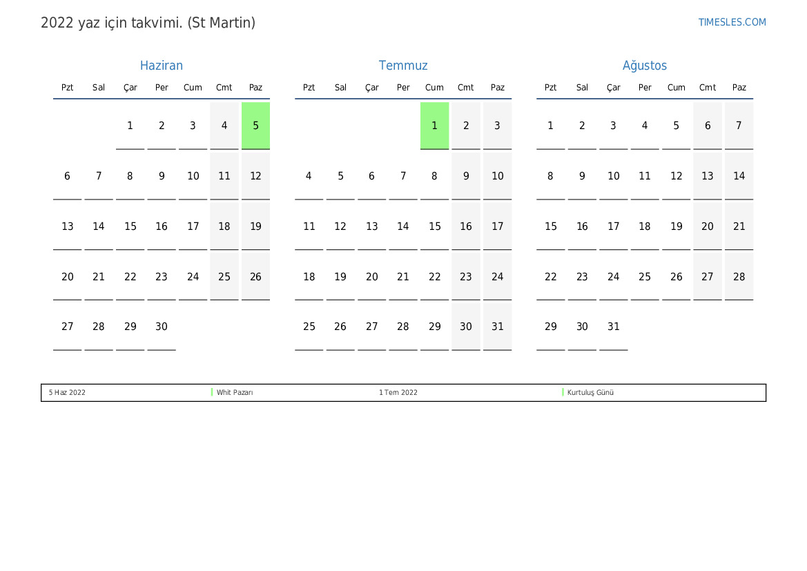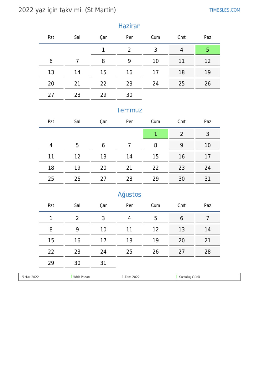Sint Maarten için 2022 yaz için tatiller ve hafta sonları içeren PDF takvimini indirin ve yazdırın