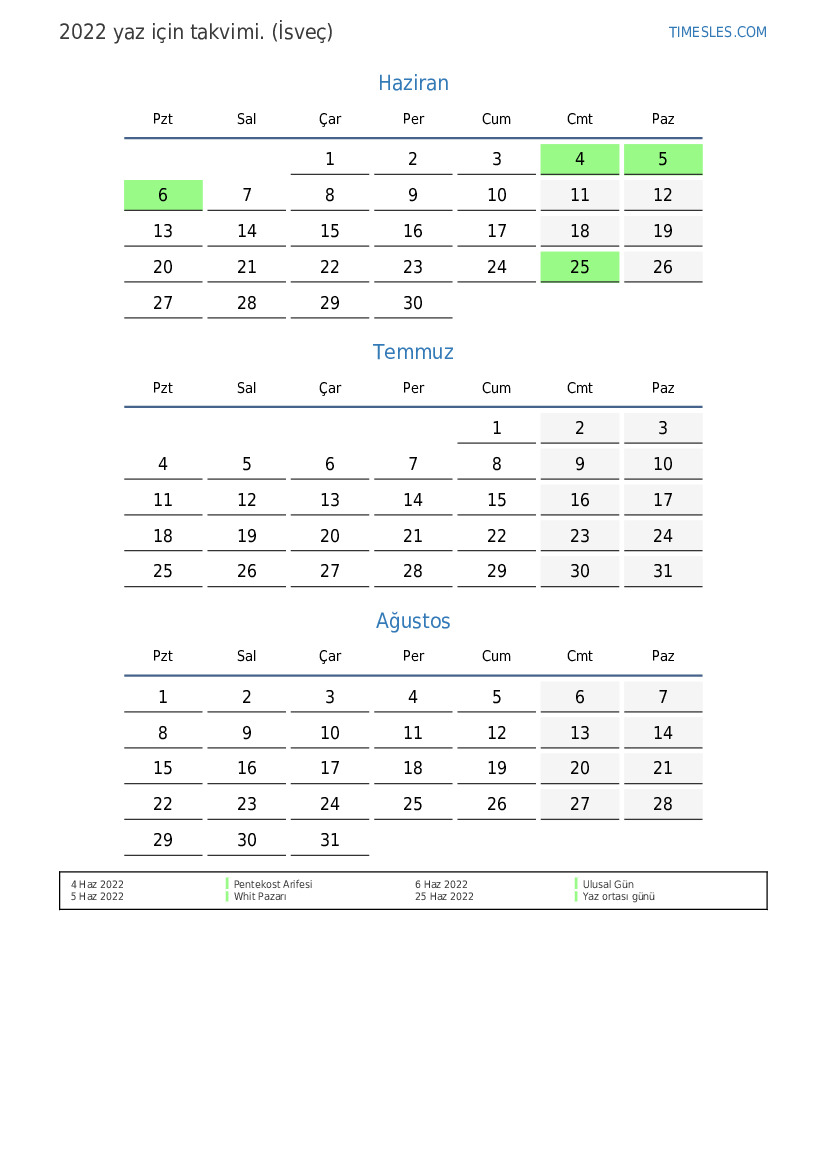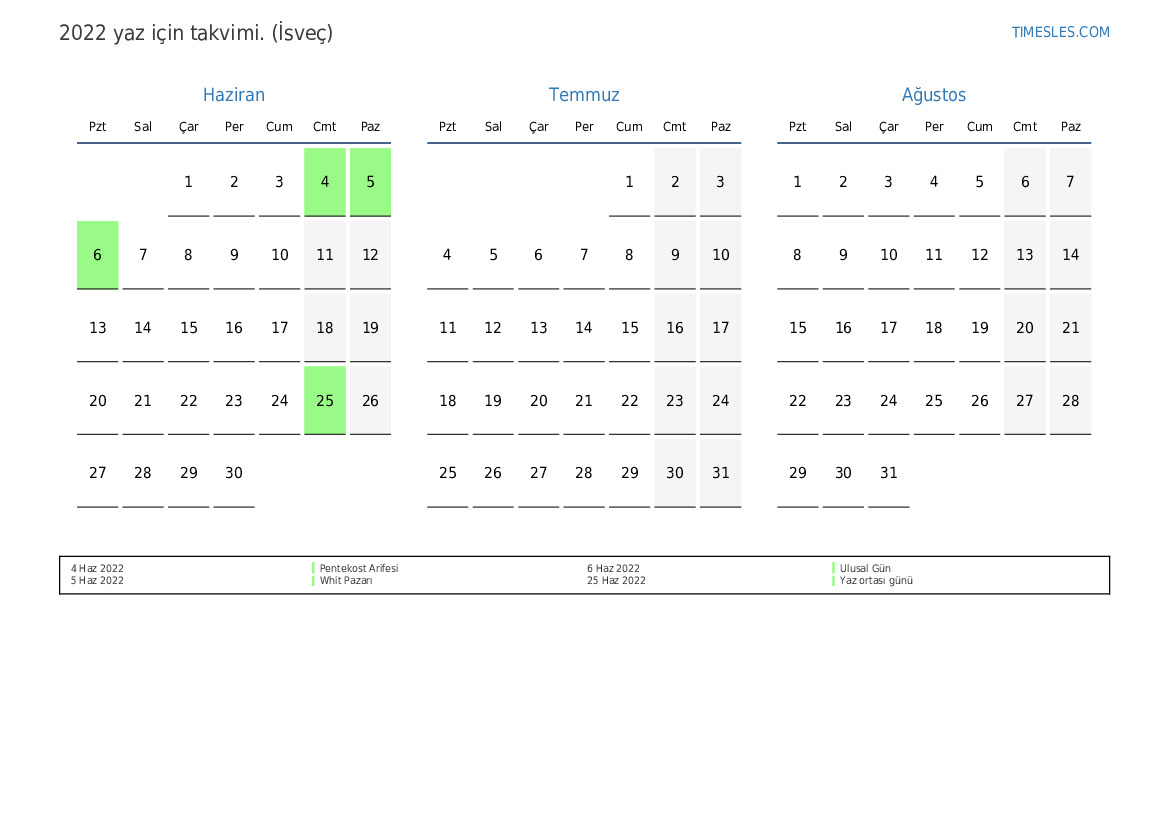 İsveç için 2022 yaz için tatiller ve hafta sonları içeren PDF takvimini indirin ve yazdırın