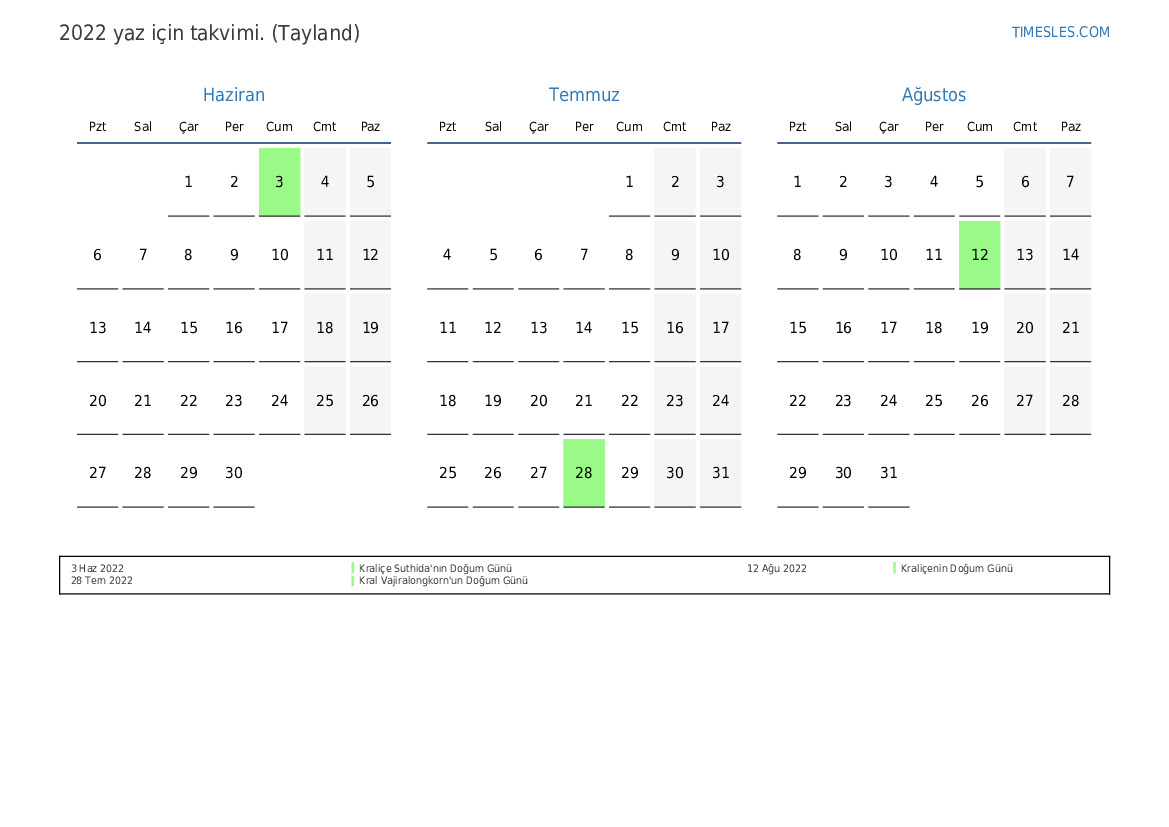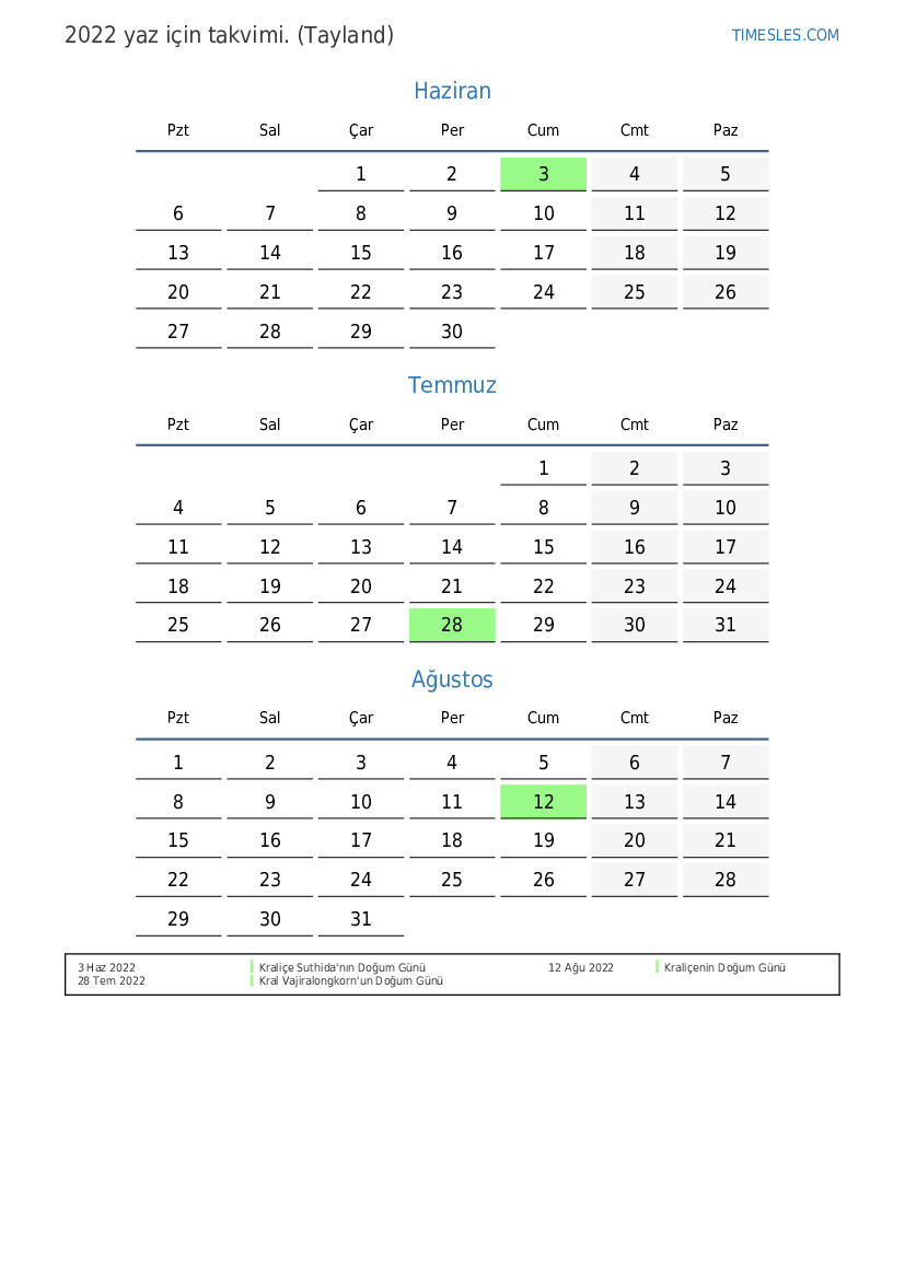Tayland için 2022 yaz için tatiller ve hafta sonları içeren PDF takvimini indirin ve yazdırın