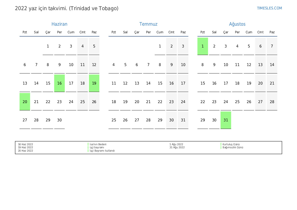 Trinidad ve Tobago için 2022 yaz için tatil ve hafta sonları takvimi