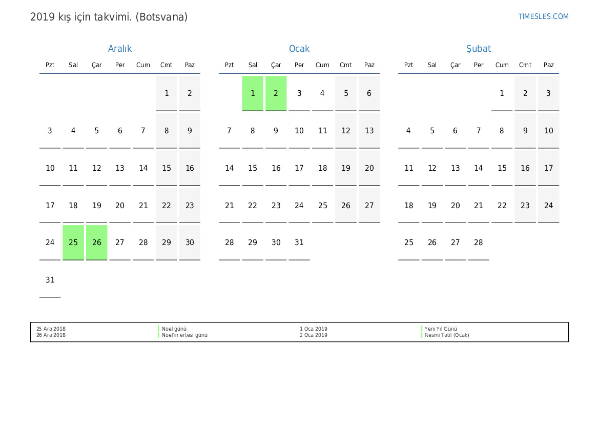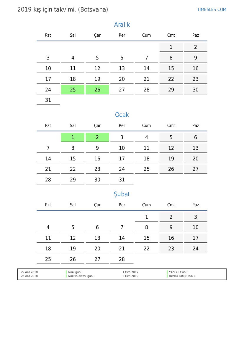 Botsvana için 2019 kış için tatiller ve hafta sonları içeren PDF takvimini indirin ve yazdırın