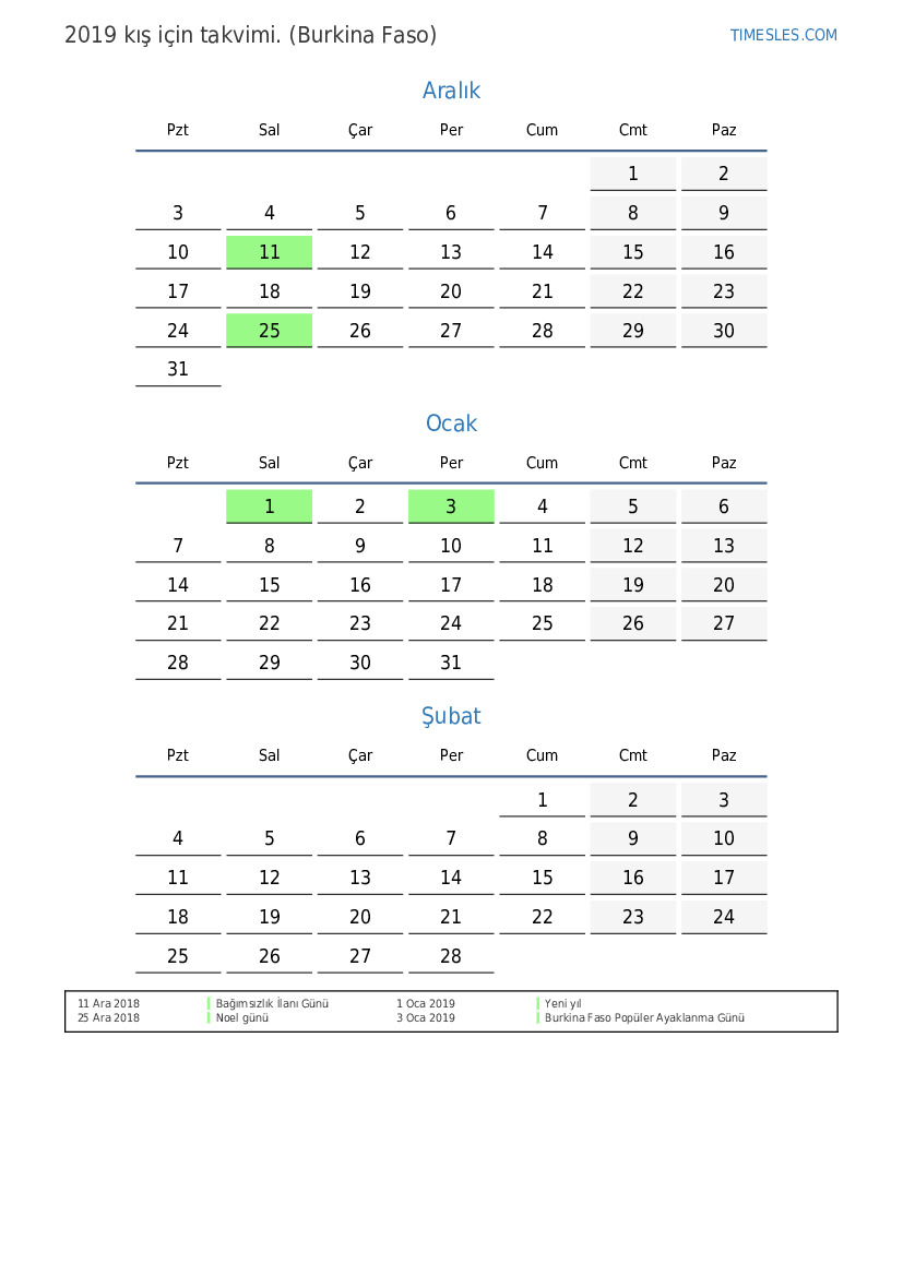 Burkina Faso için 2019 kış için tatiller ve hafta sonları içeren PDF takvimini indirin ve yazdırın