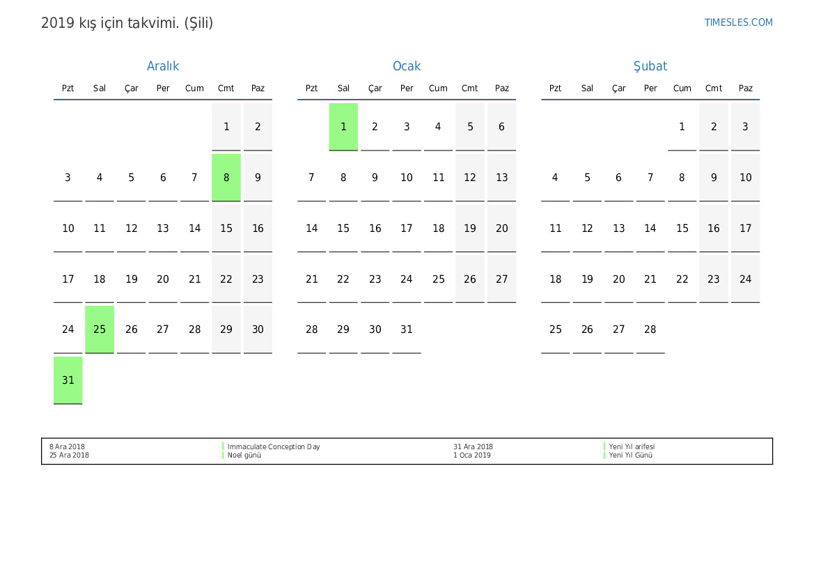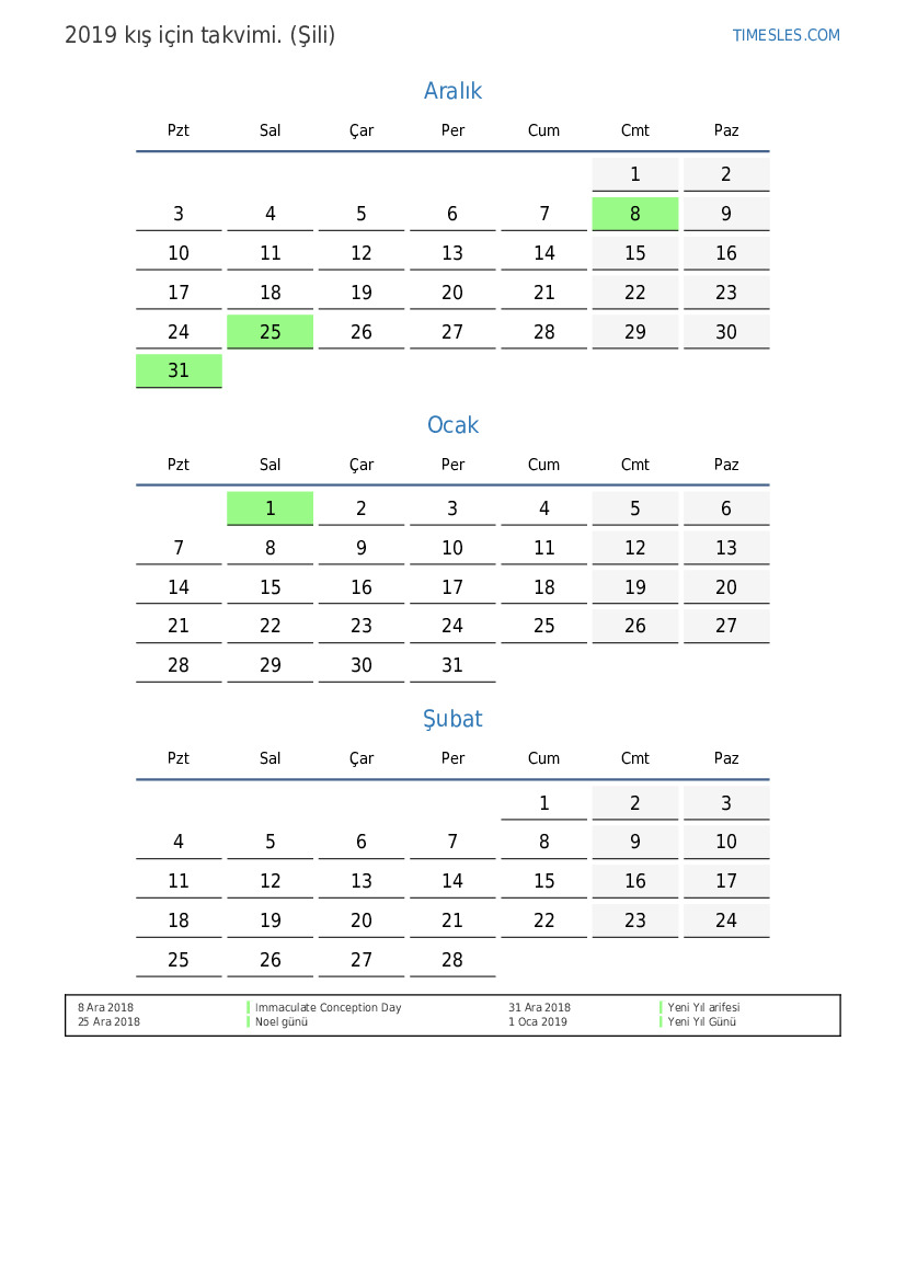 Şili için 2019 kış için tatil ve hafta sonları takvimi