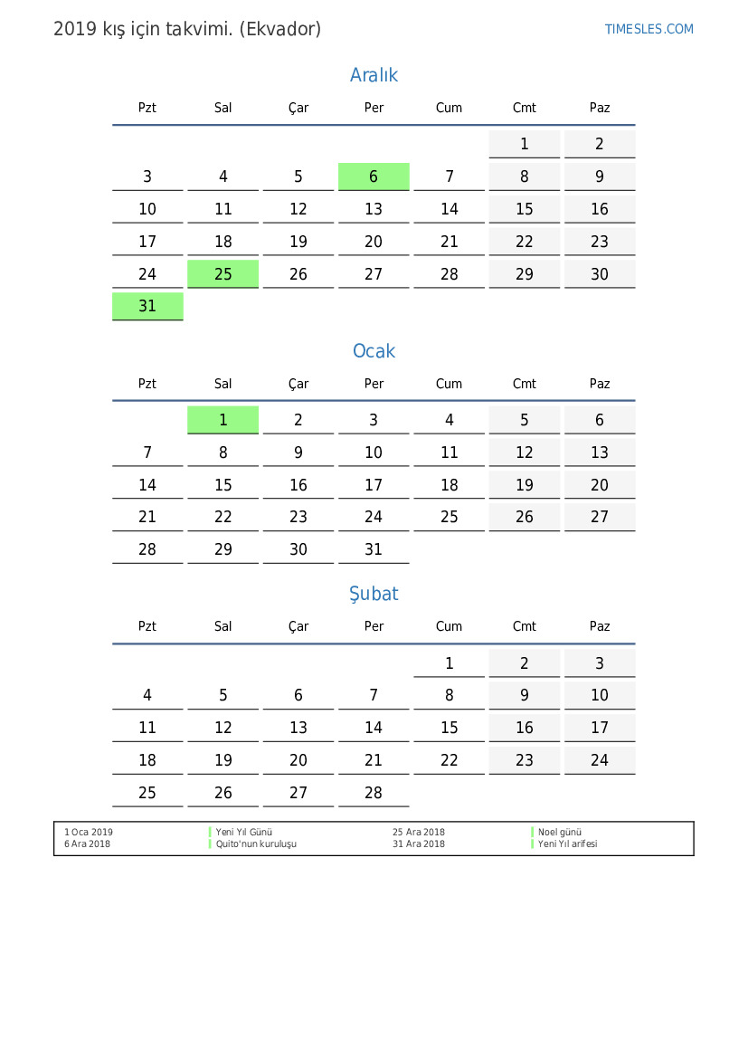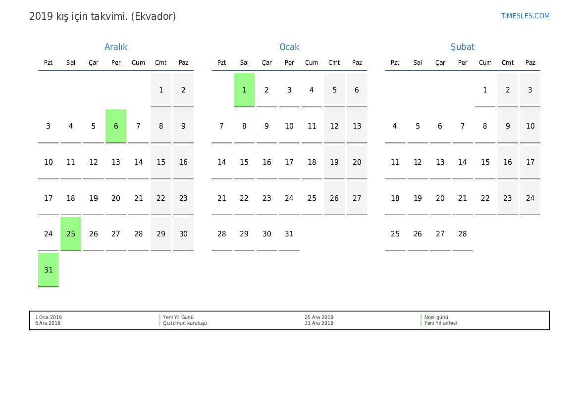 Ekvador için 2019 kış için tatiller ve hafta sonları içeren PDF takvimini indirin ve yazdırın