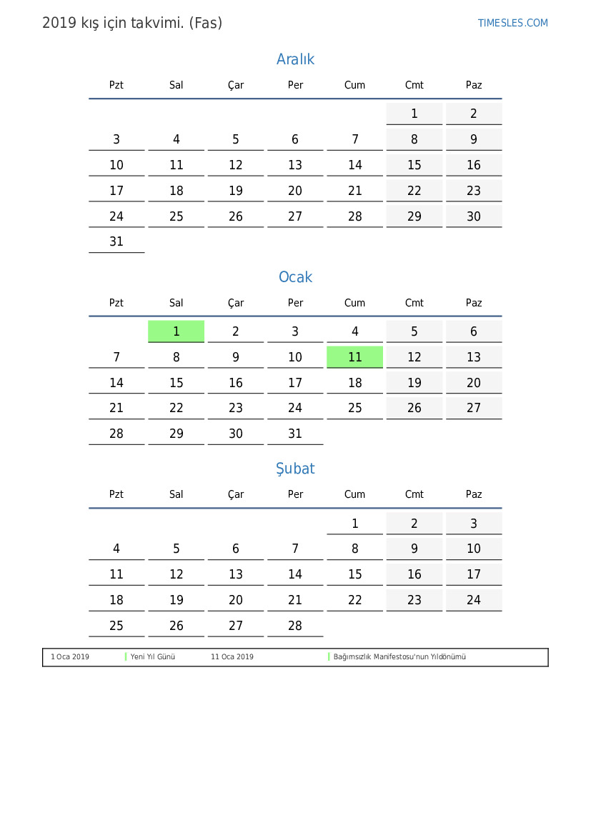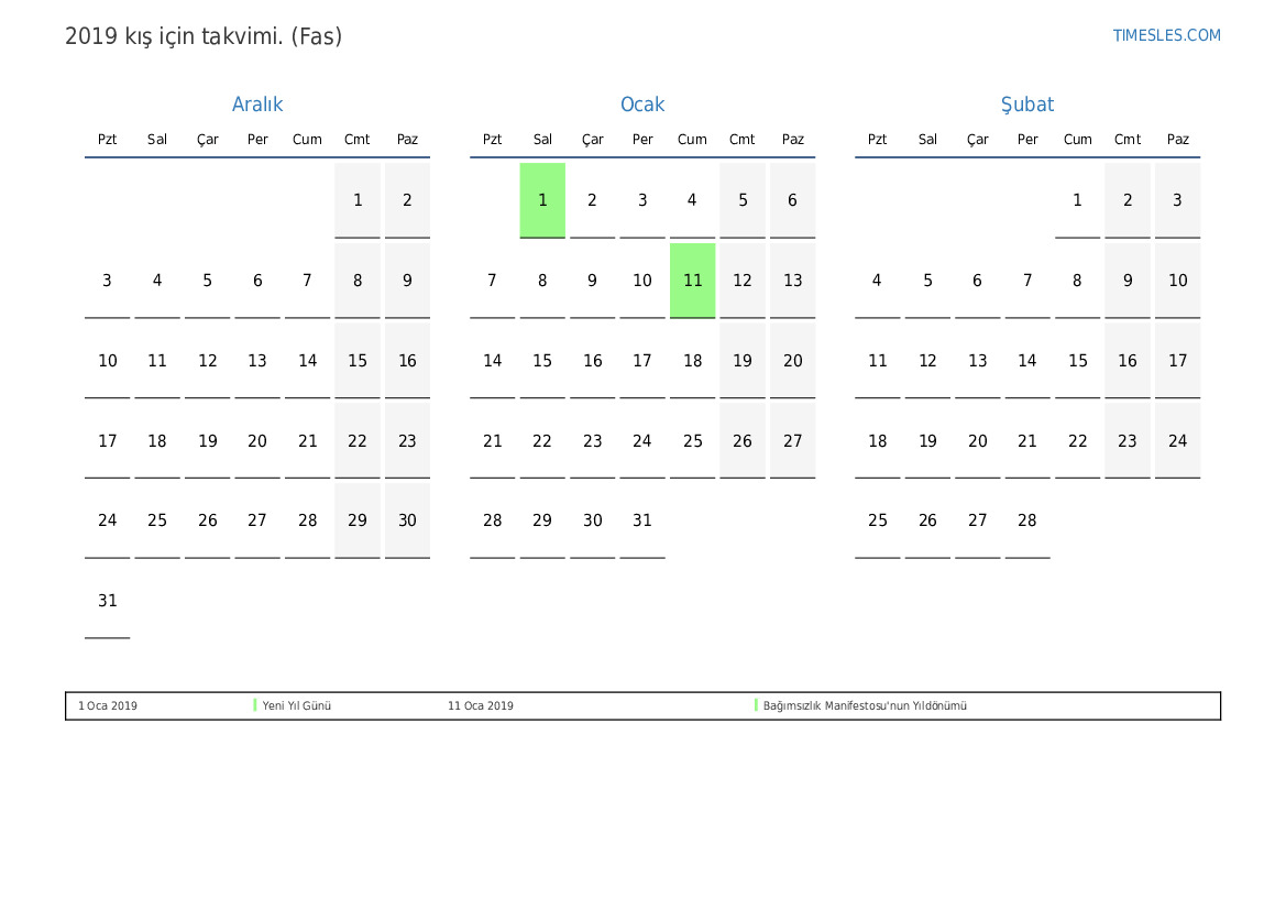 Fas için 2019 kış için tatil ve hafta sonları takvimi