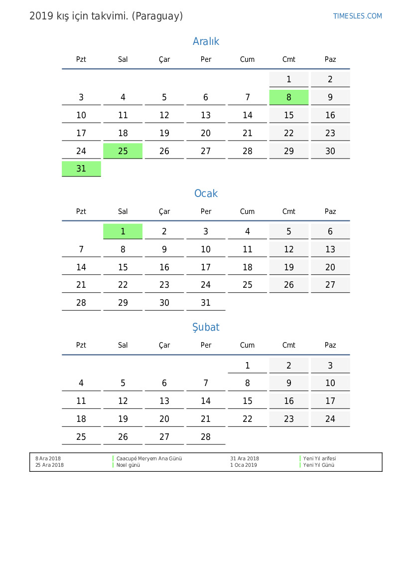 Paraguay için 2019 kış için tatiller ve hafta sonları içeren PDF takvimini indirin ve yazdırın