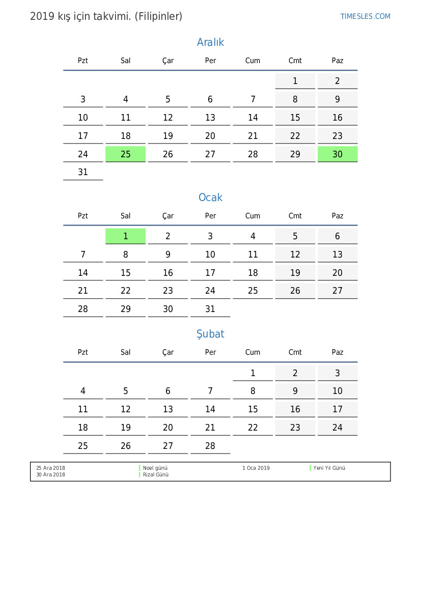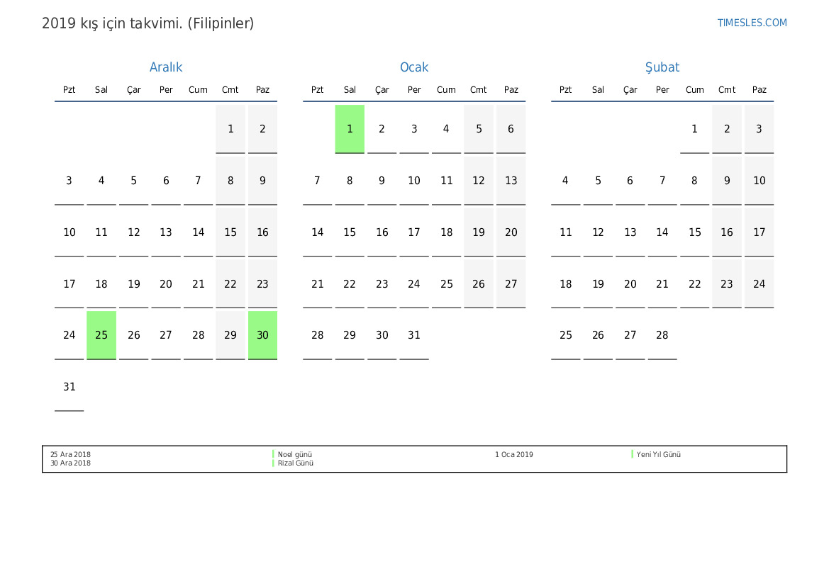 Filipinler için 2019 kış için tatiller ve hafta sonları içeren PDF takvimini indirin ve yazdırın