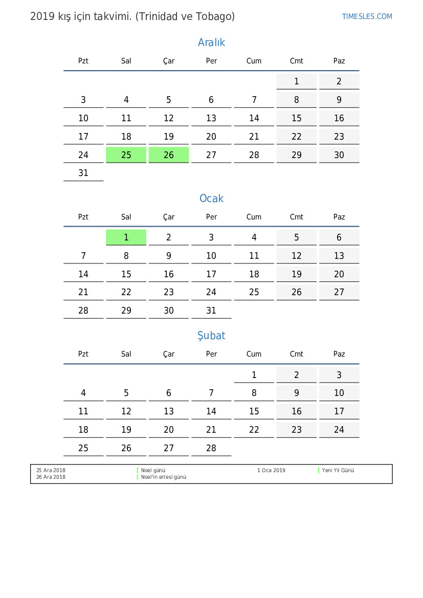 Trinidad ve Tobago için 2019 kış için tatiller ve hafta sonları içeren PDF takvimini indirin ve yazdırın